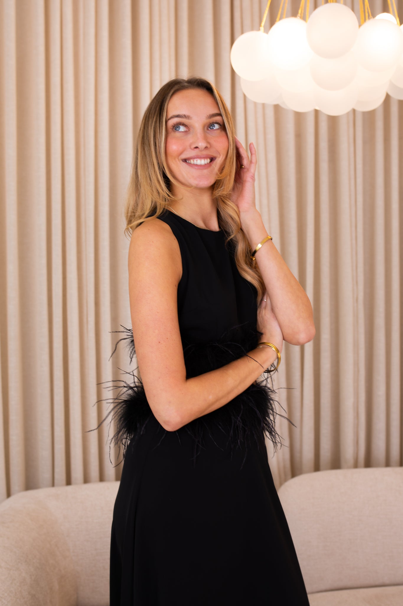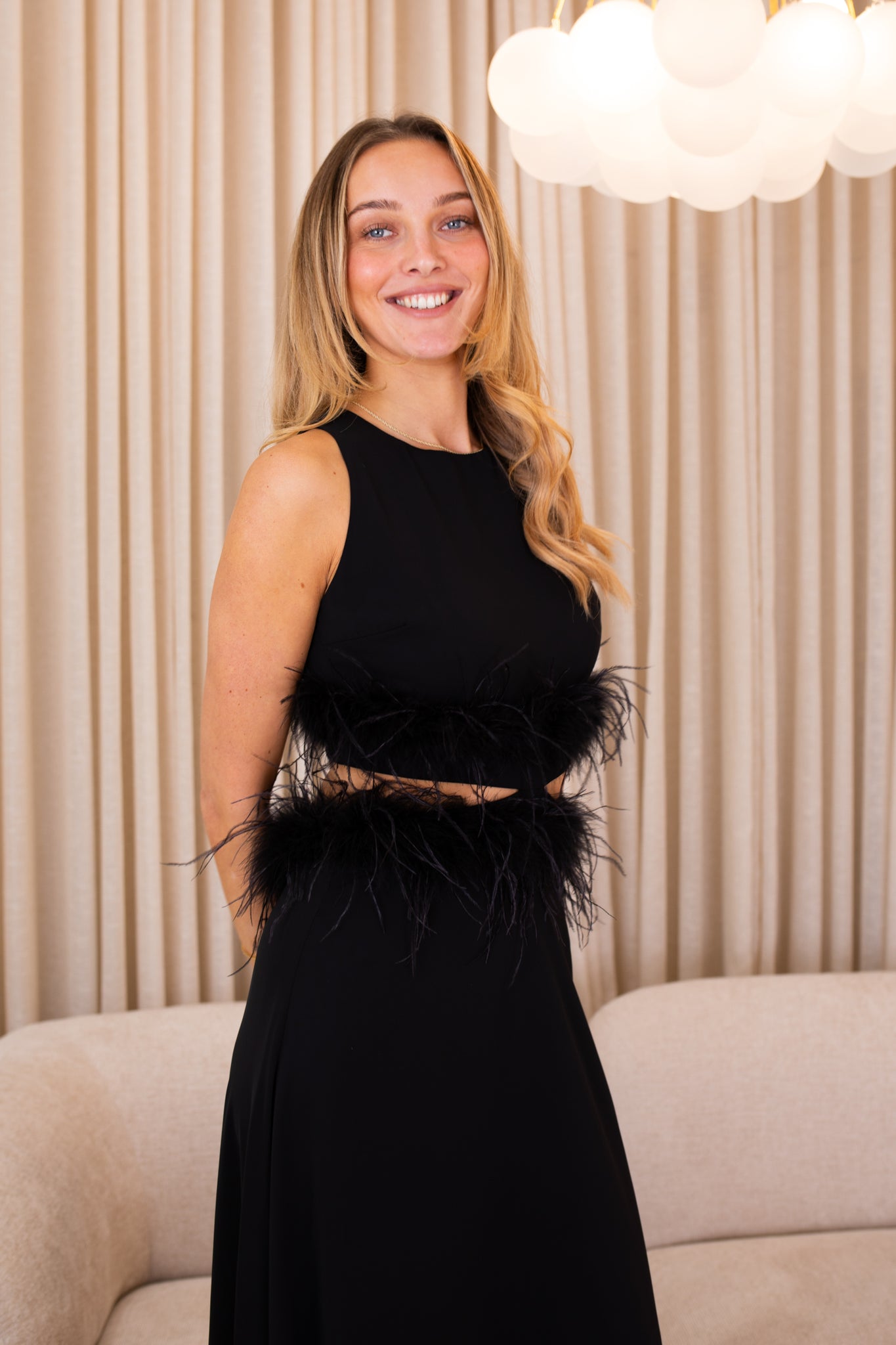 Full length dress in an elegant a-line shape. This style is sleeveless and has a cut out detail at the waist as well as fun feather adornments. This dress is a real statement style, perfect for a special occasion.