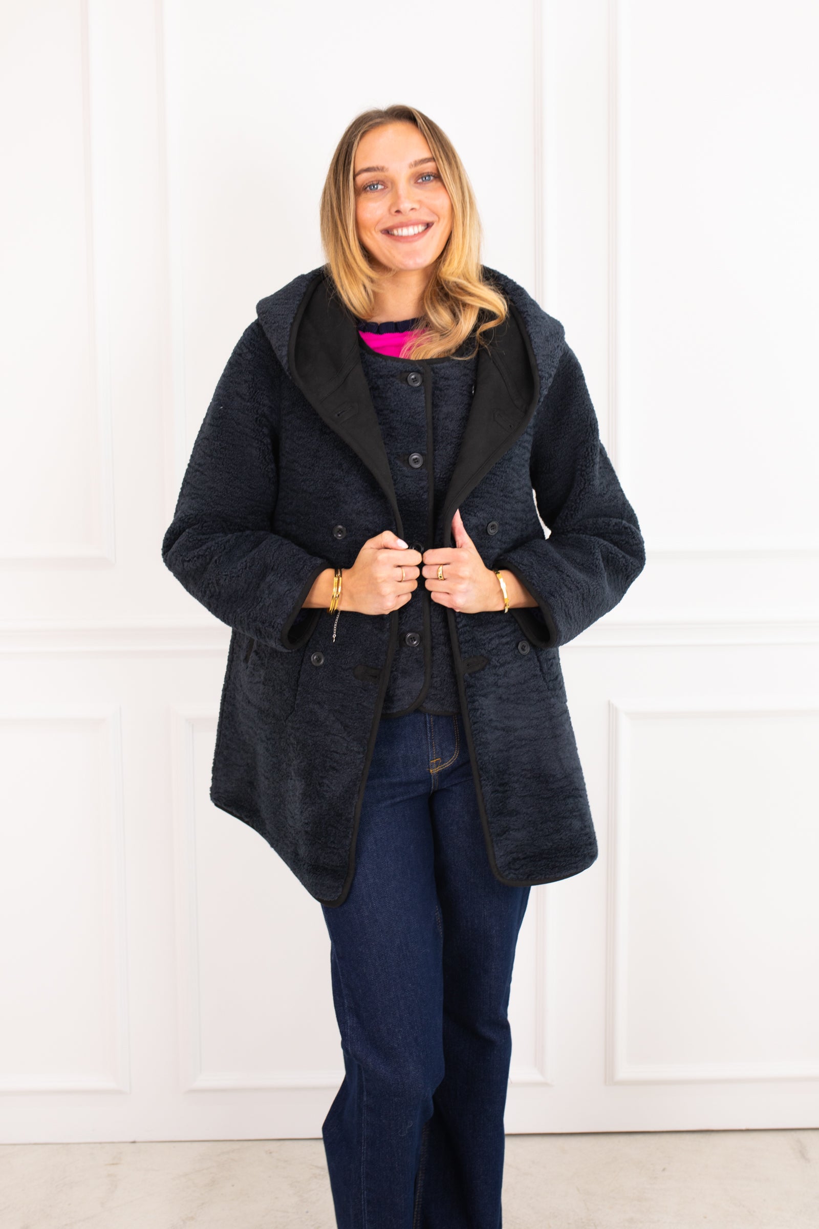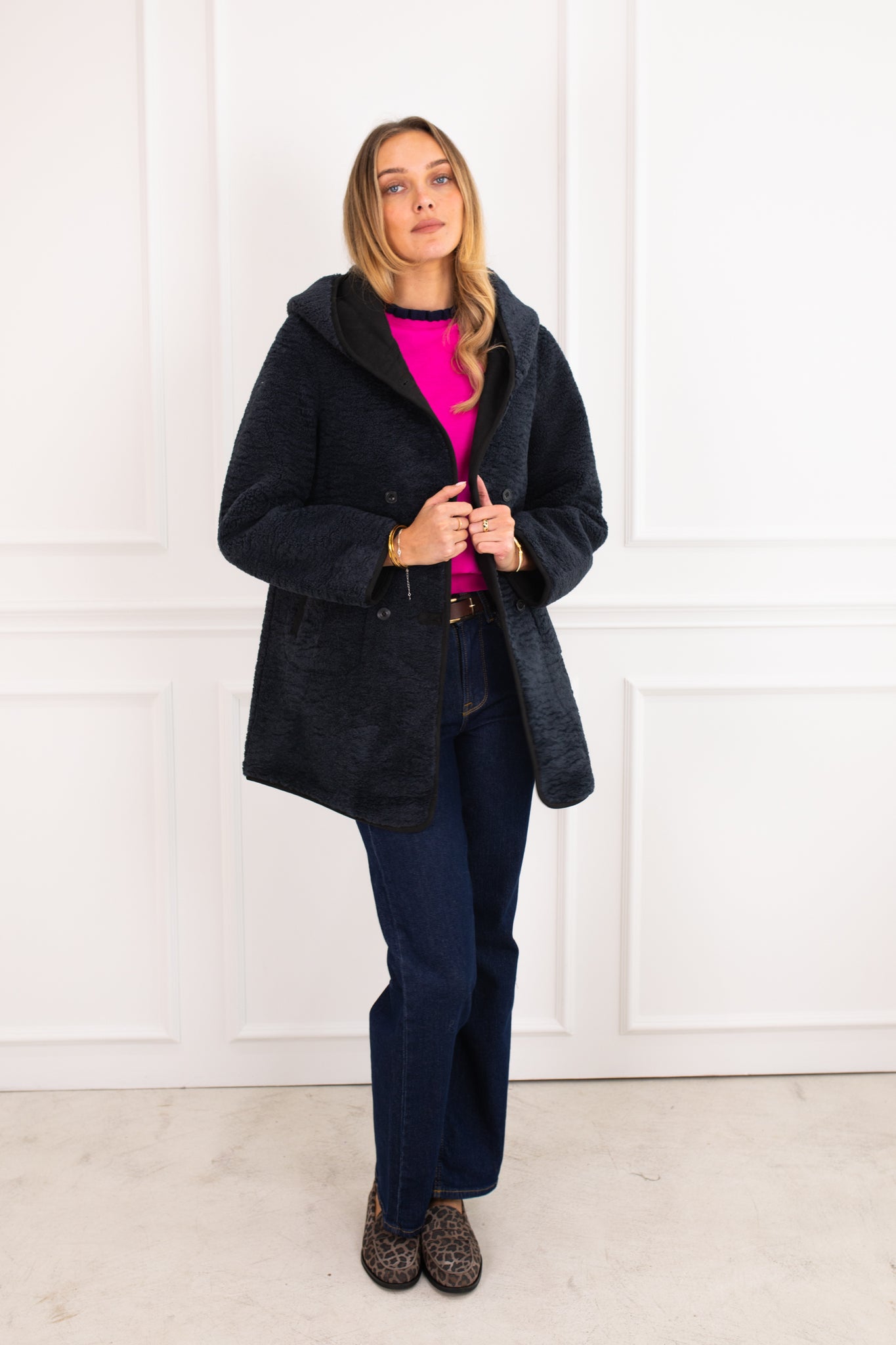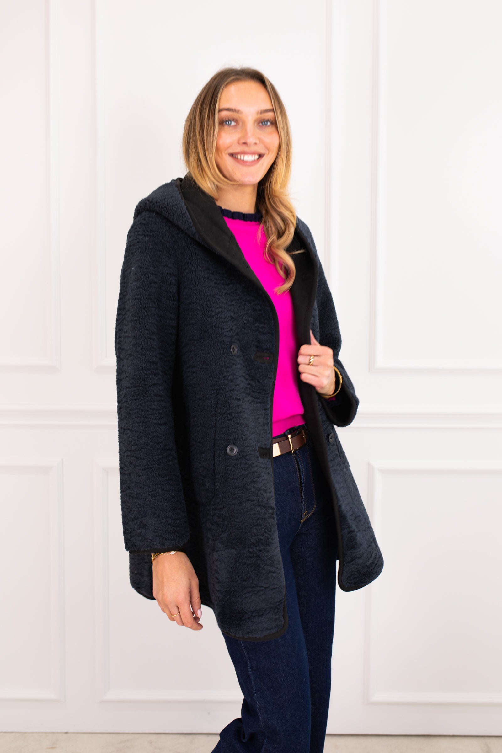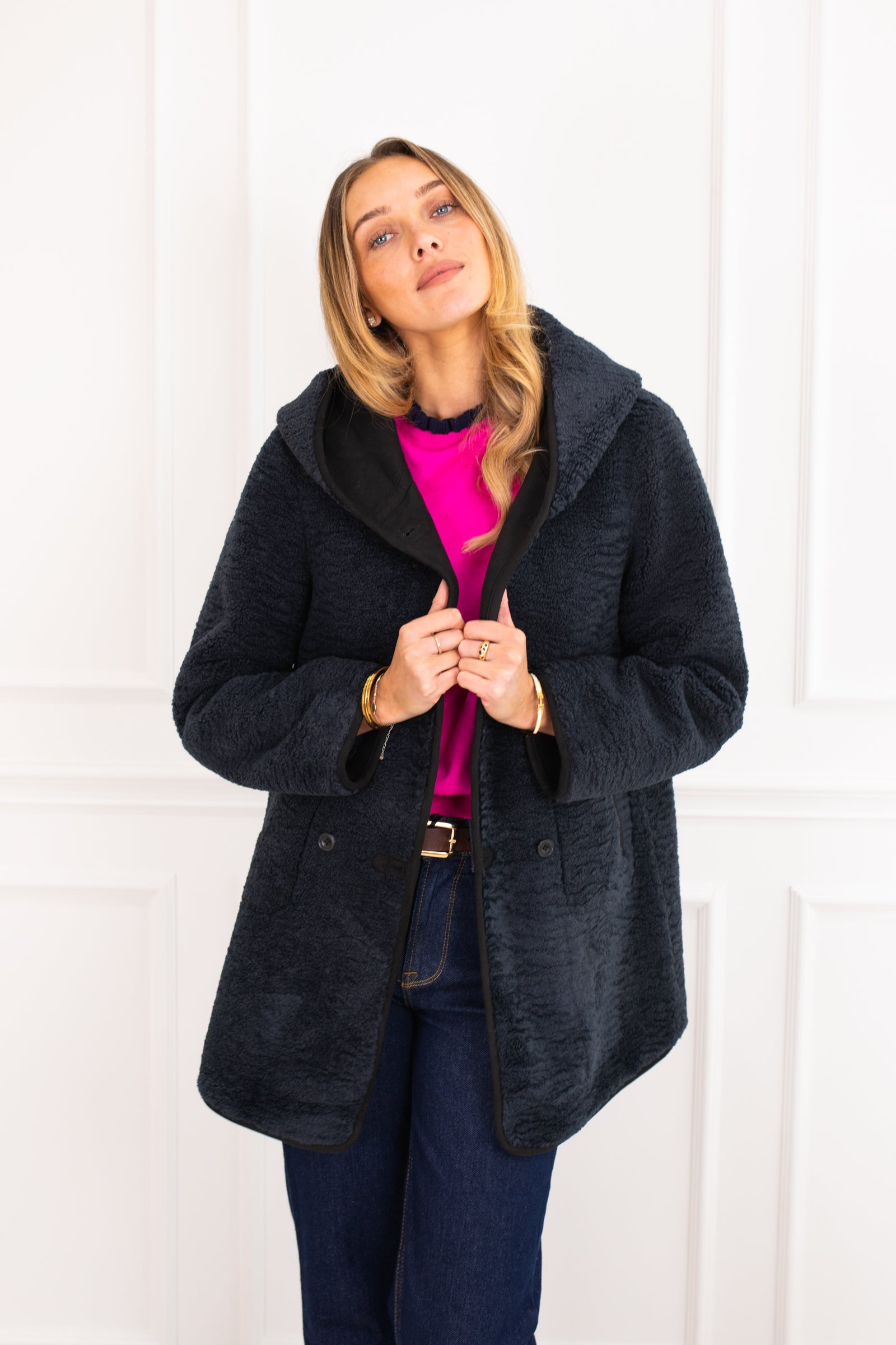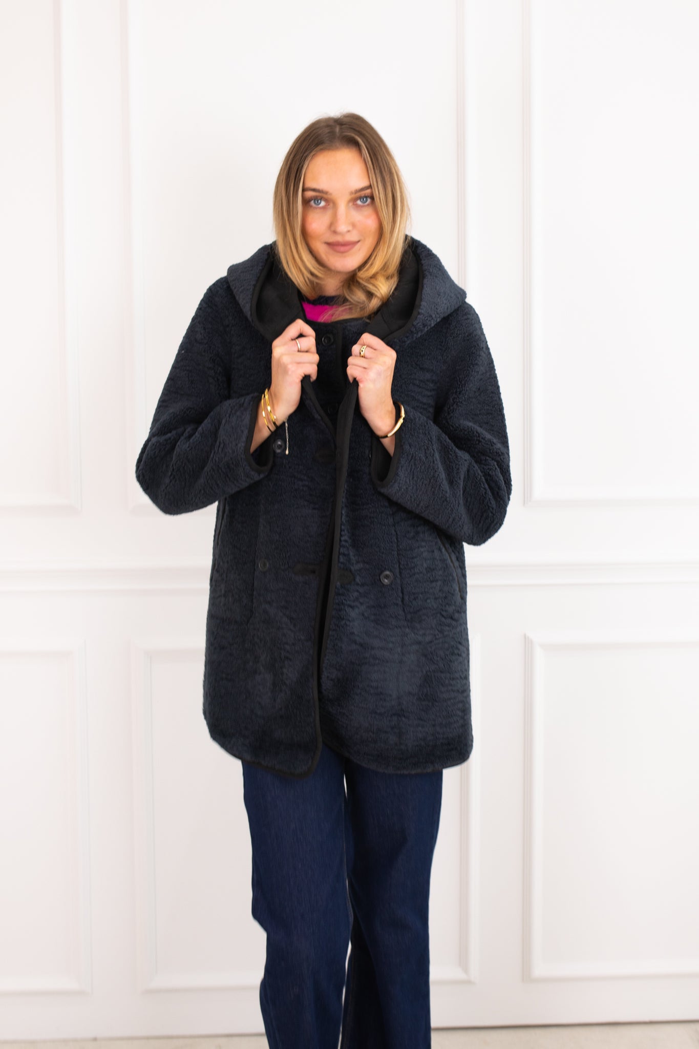 Reversible shearling coat in a deep navy with a hood. This cosy style is crafted from thick, luxurious faux shearling fabric and gives two styling options. Matching waistcoat available.