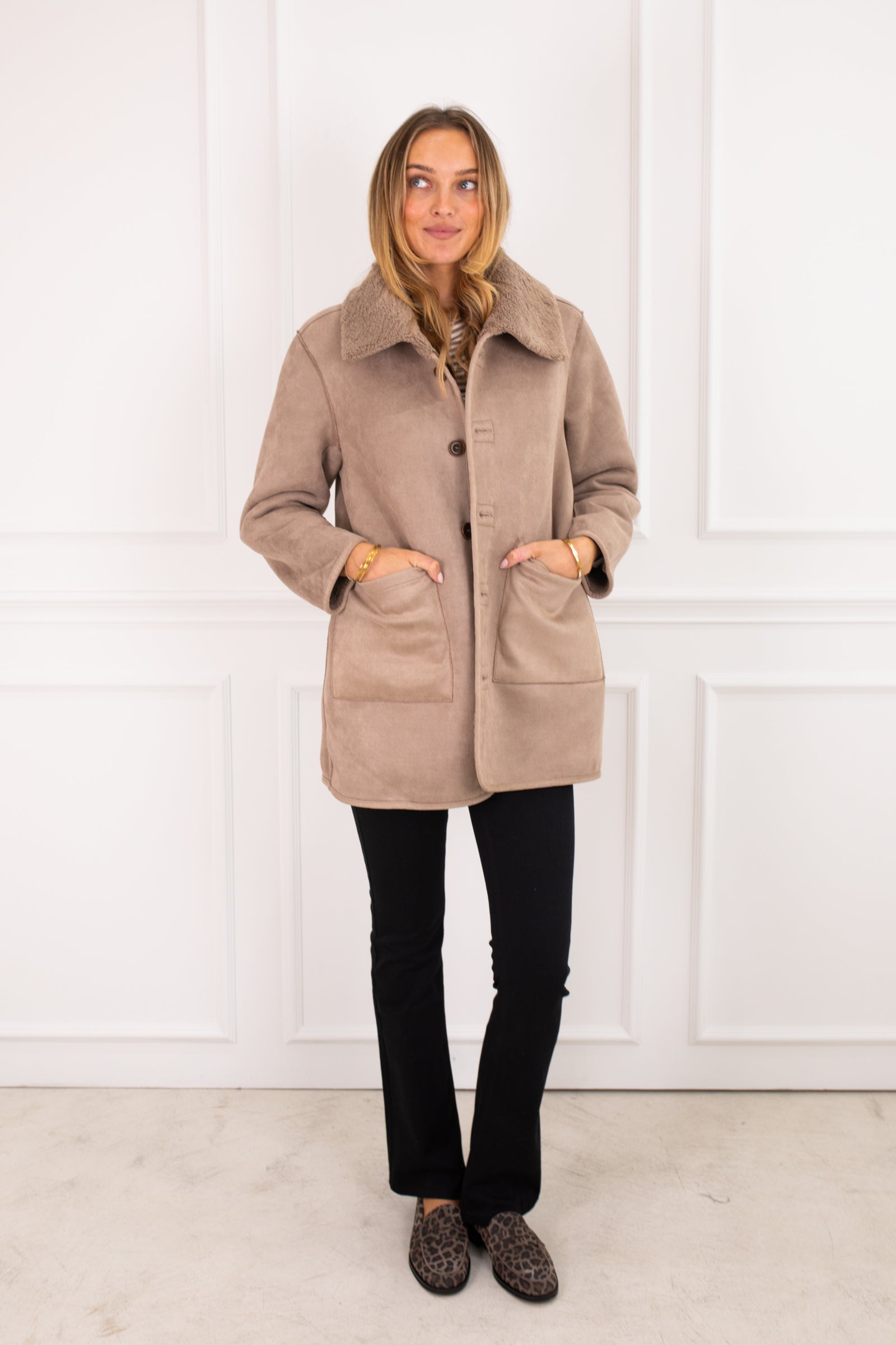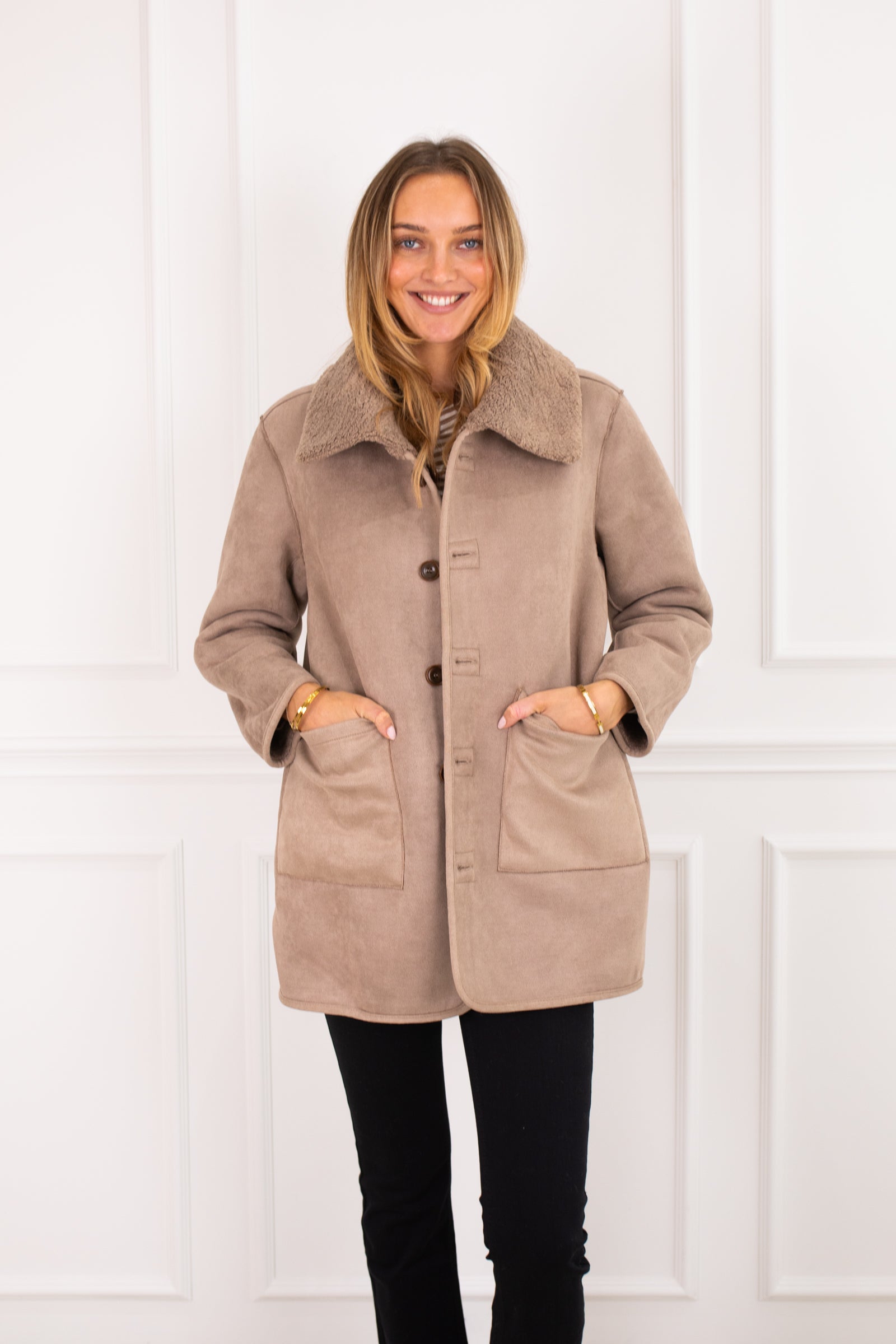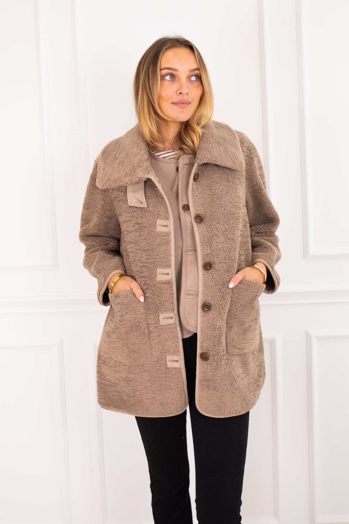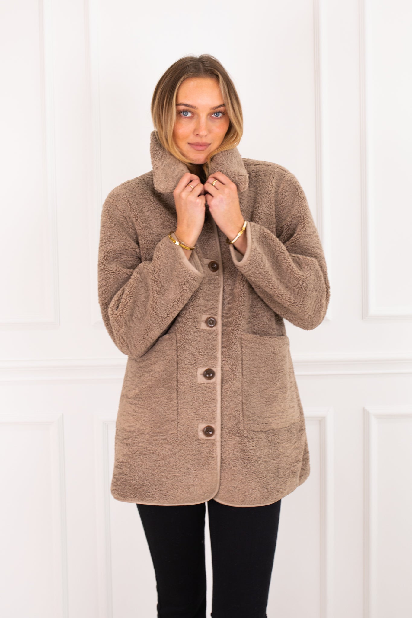Reversible shearling coat in a rich taupe tone. This cosy style is crafted from thick, luxurious faux shearling fabric and gives two styling options. Matching waistcoat available.