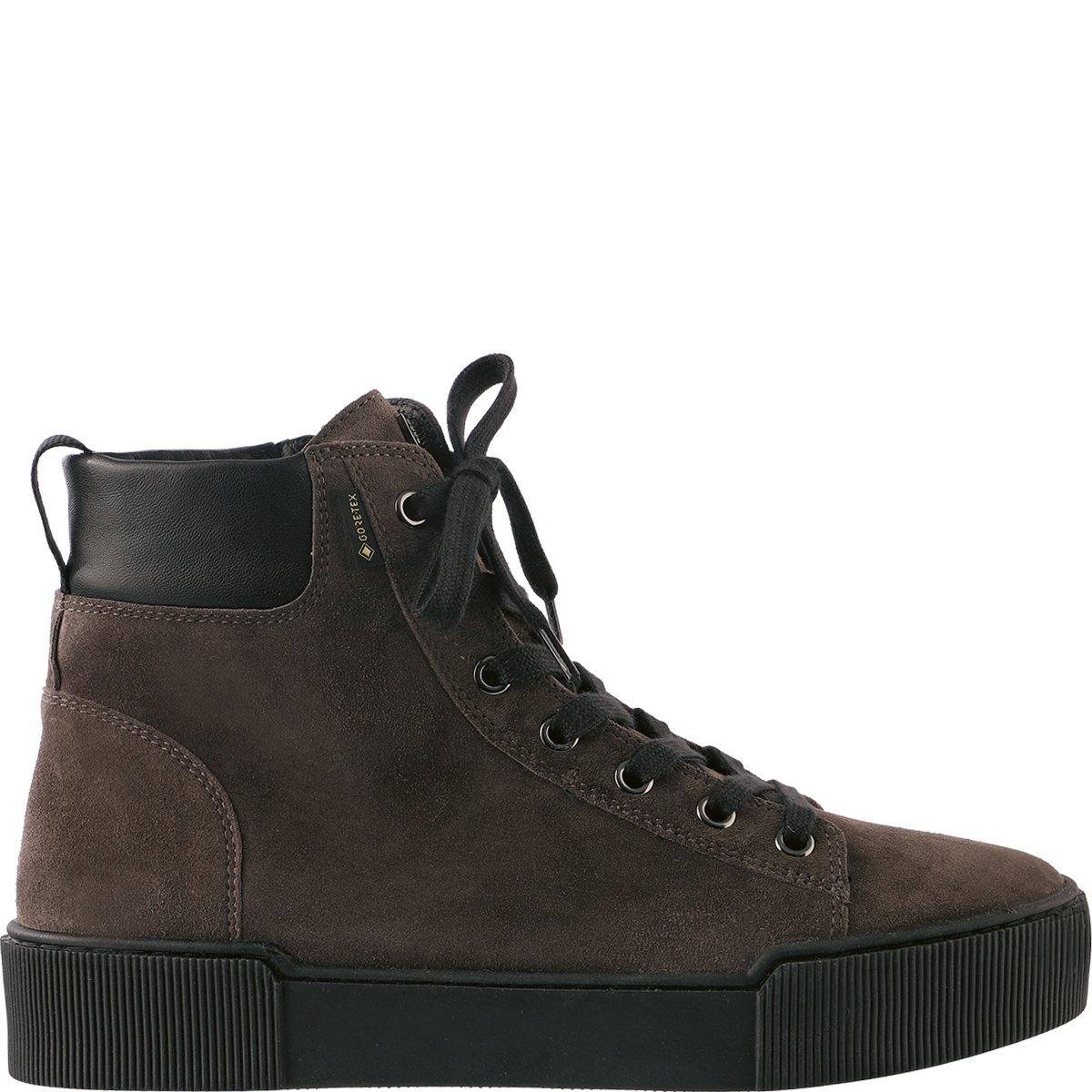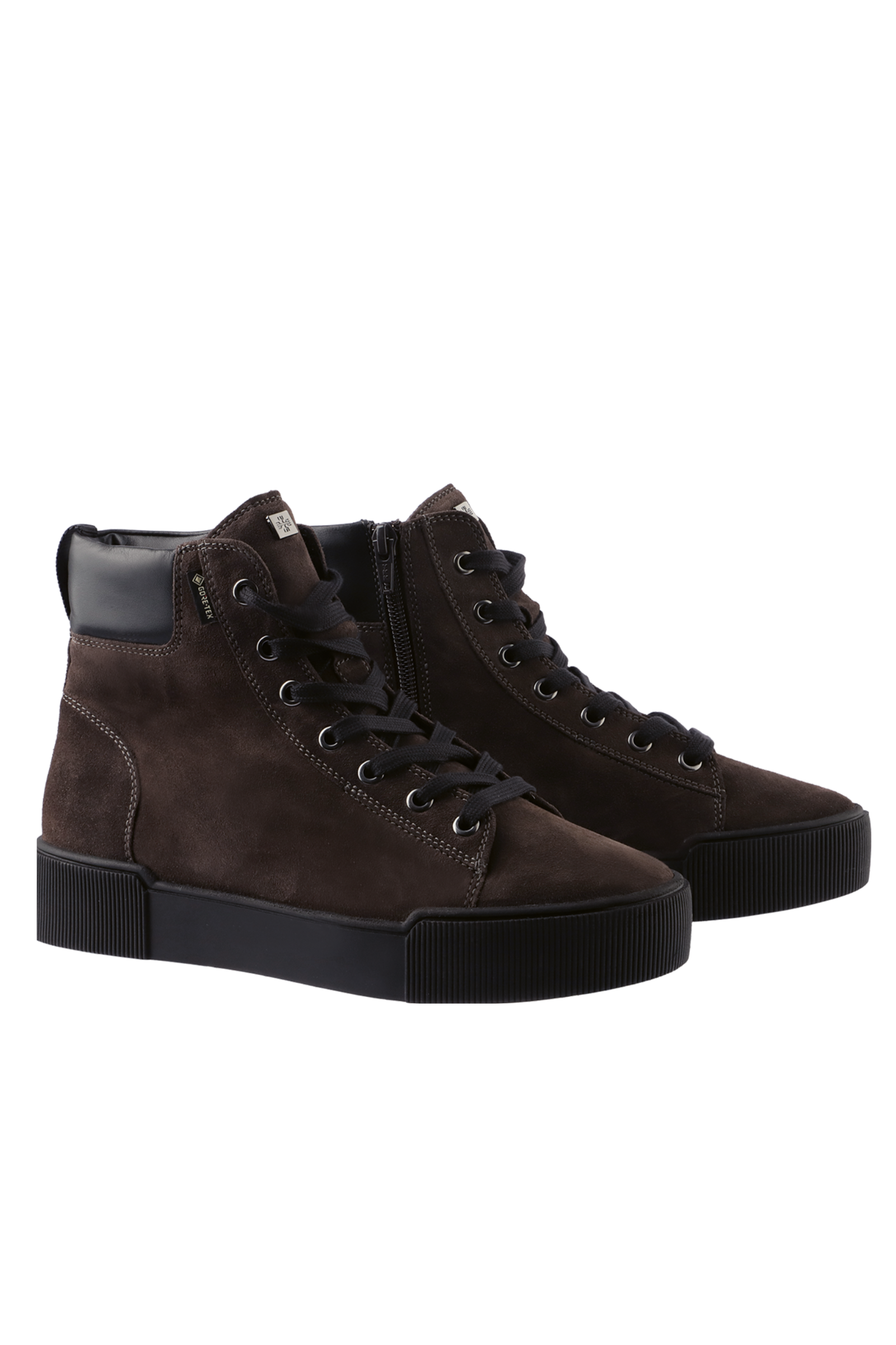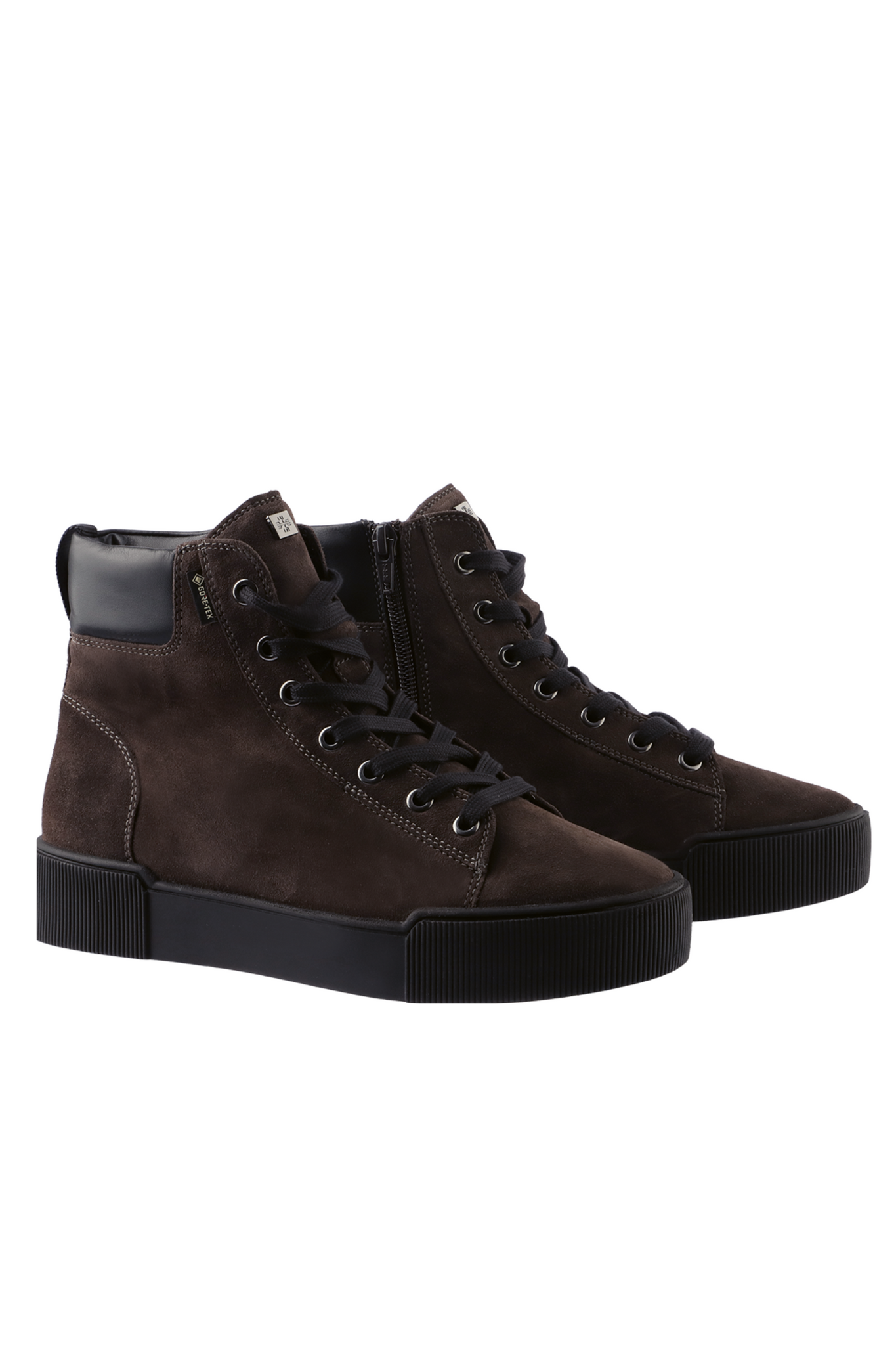 The sporty look of the sneaker is characterised by its non-slip sole and raised shaft. The Gore-Tex membrane has a waterproof effect and protects the high-quality suede of the high-top sneaker in dark grey. The tonal lacing ensures an ideal fit, while the metallic eyelets provide a visual accent. These trainers will accompany you through the fall and winter months with casual denim or simple weekend outfits.
