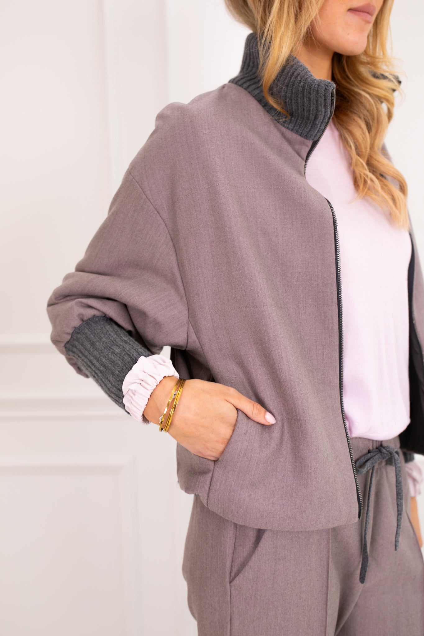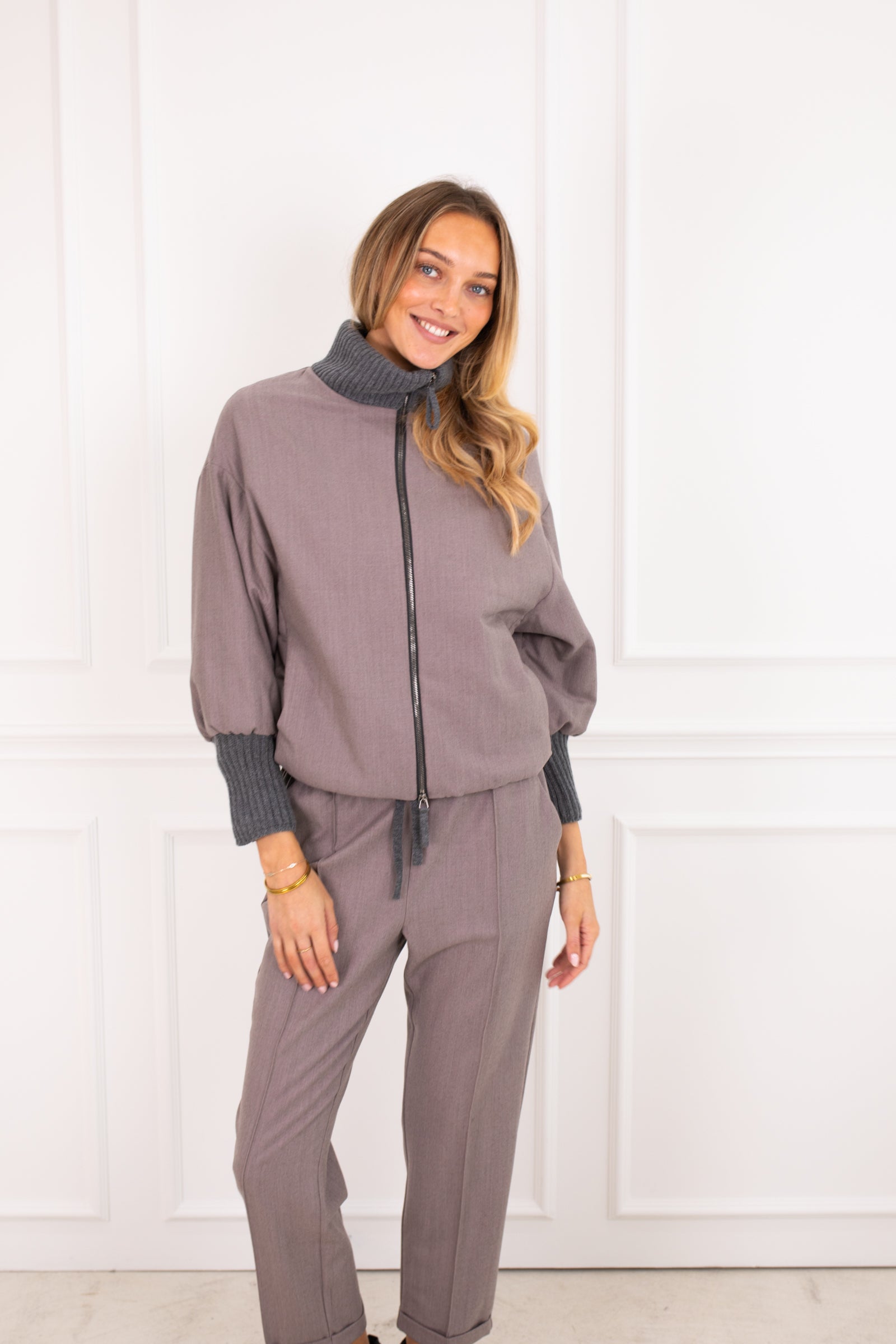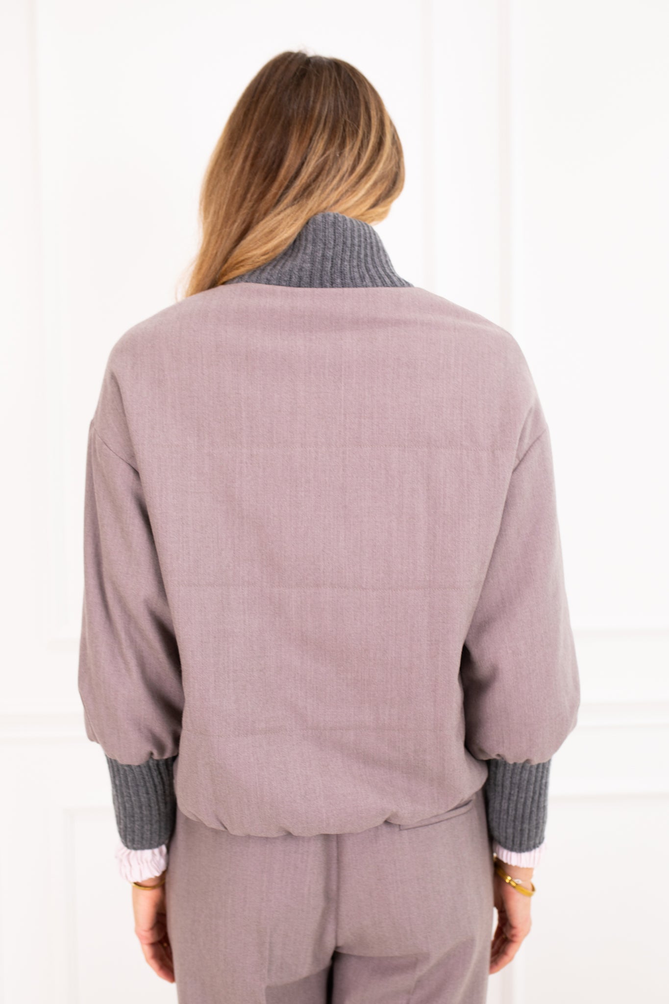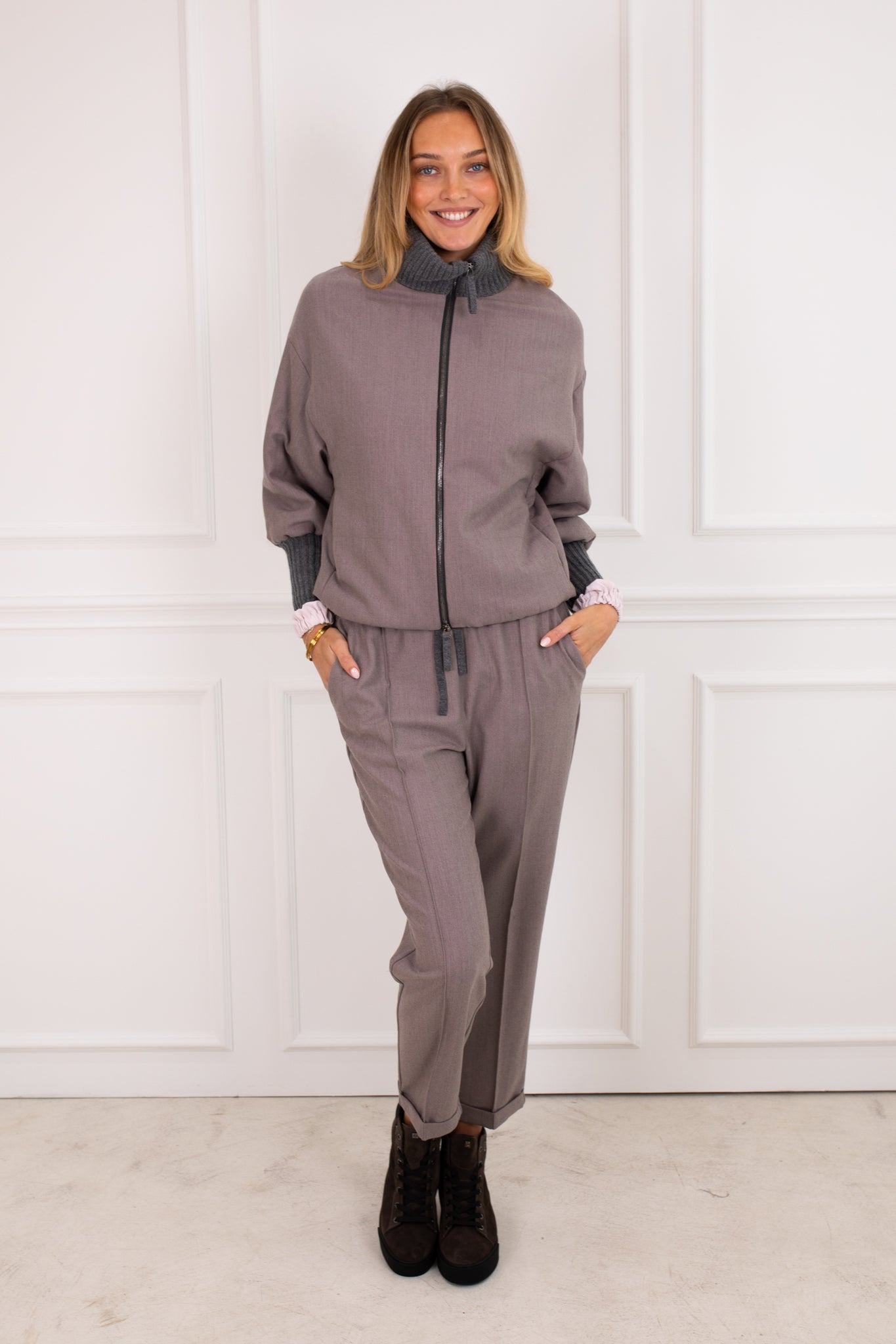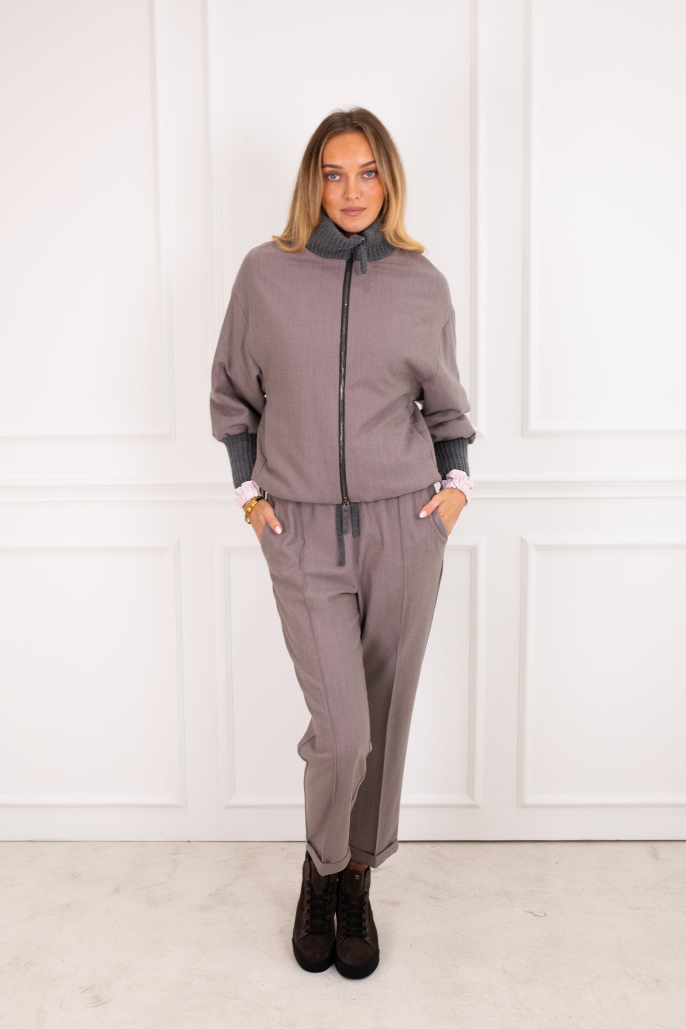Wool jacket in a bomber shape. This style has contrasting knitted cuffs and collar made rom a silk, cashmere blend wool. The jacket is slightly padded and has a zip closure to the front. The high collar and relaxed shape exudes luxury and style. Wear it with the co-ordinating Lowry Pants.