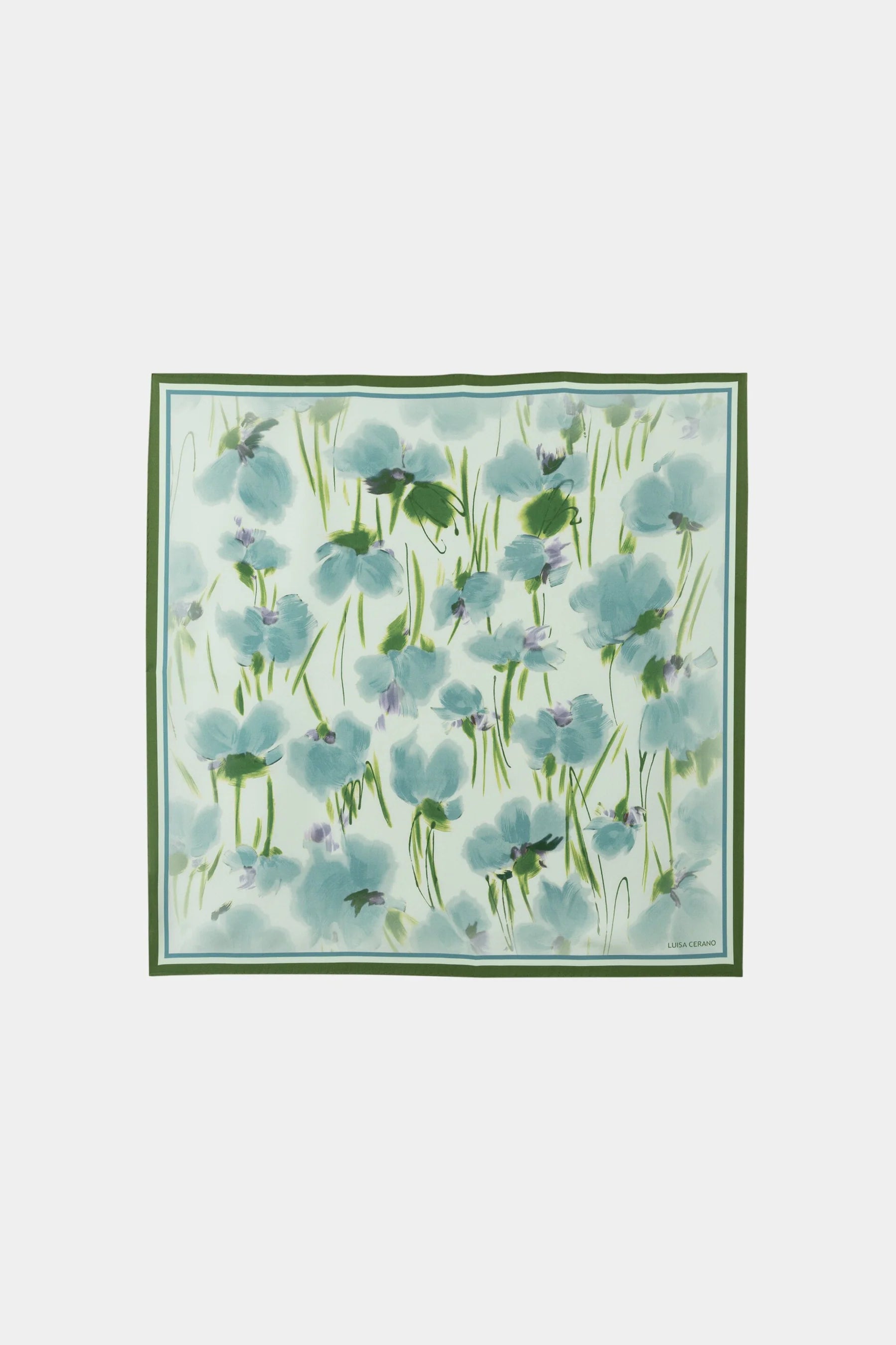 Rectangular scarf made of pure silk with an exclusive floral print. The brand lettering is incorporated at the edge of the hem.