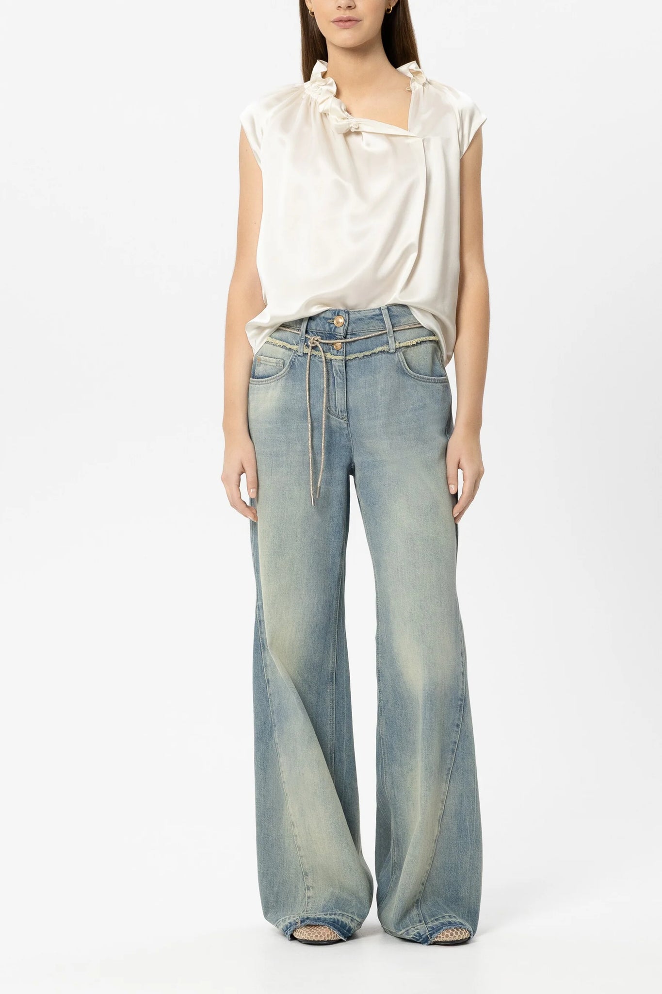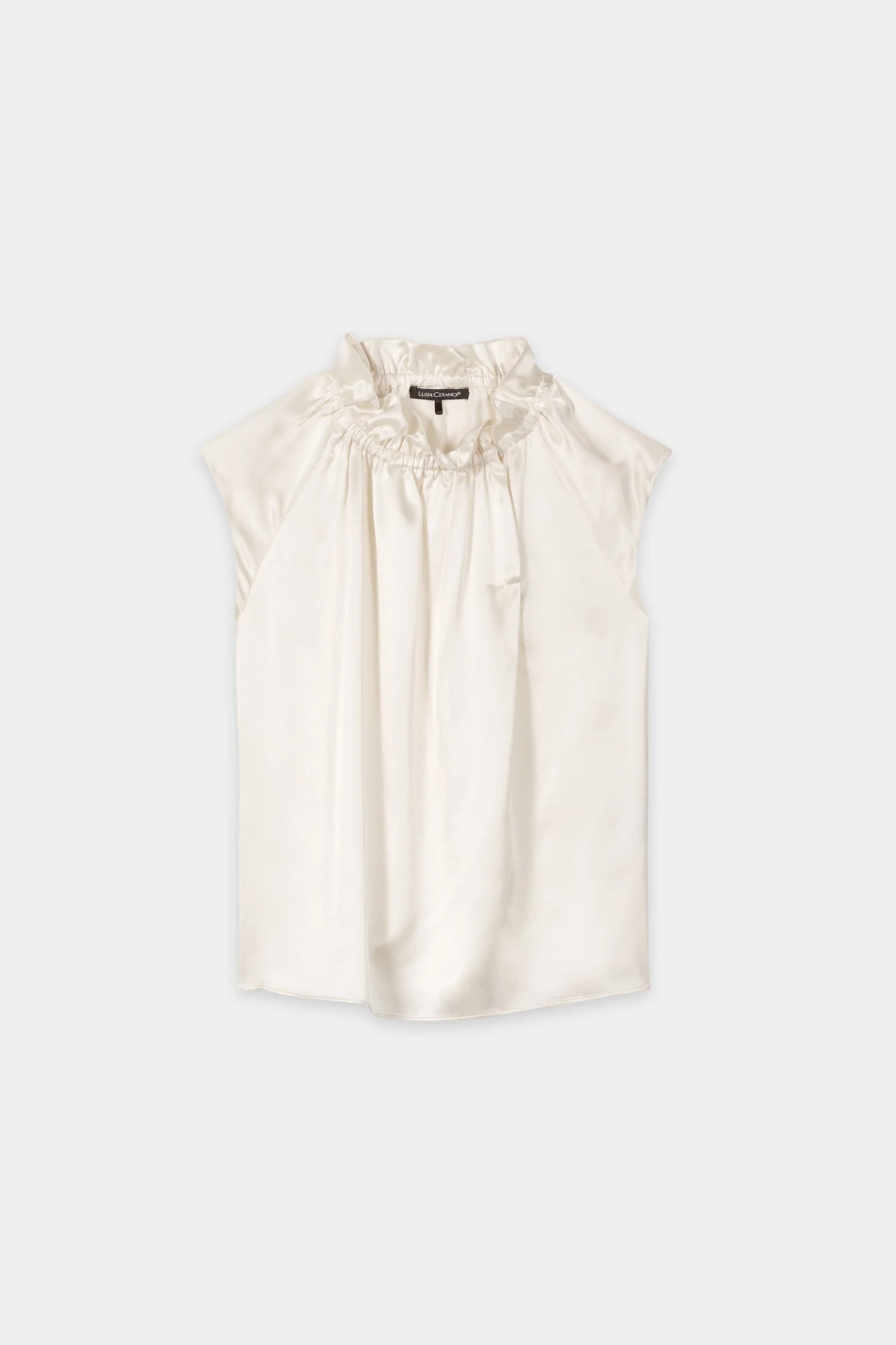 Sleeveless blouse top made from luxurious silk satin with an elegant sheen. The ruffled collar with button fastening gives the top a playful touch.