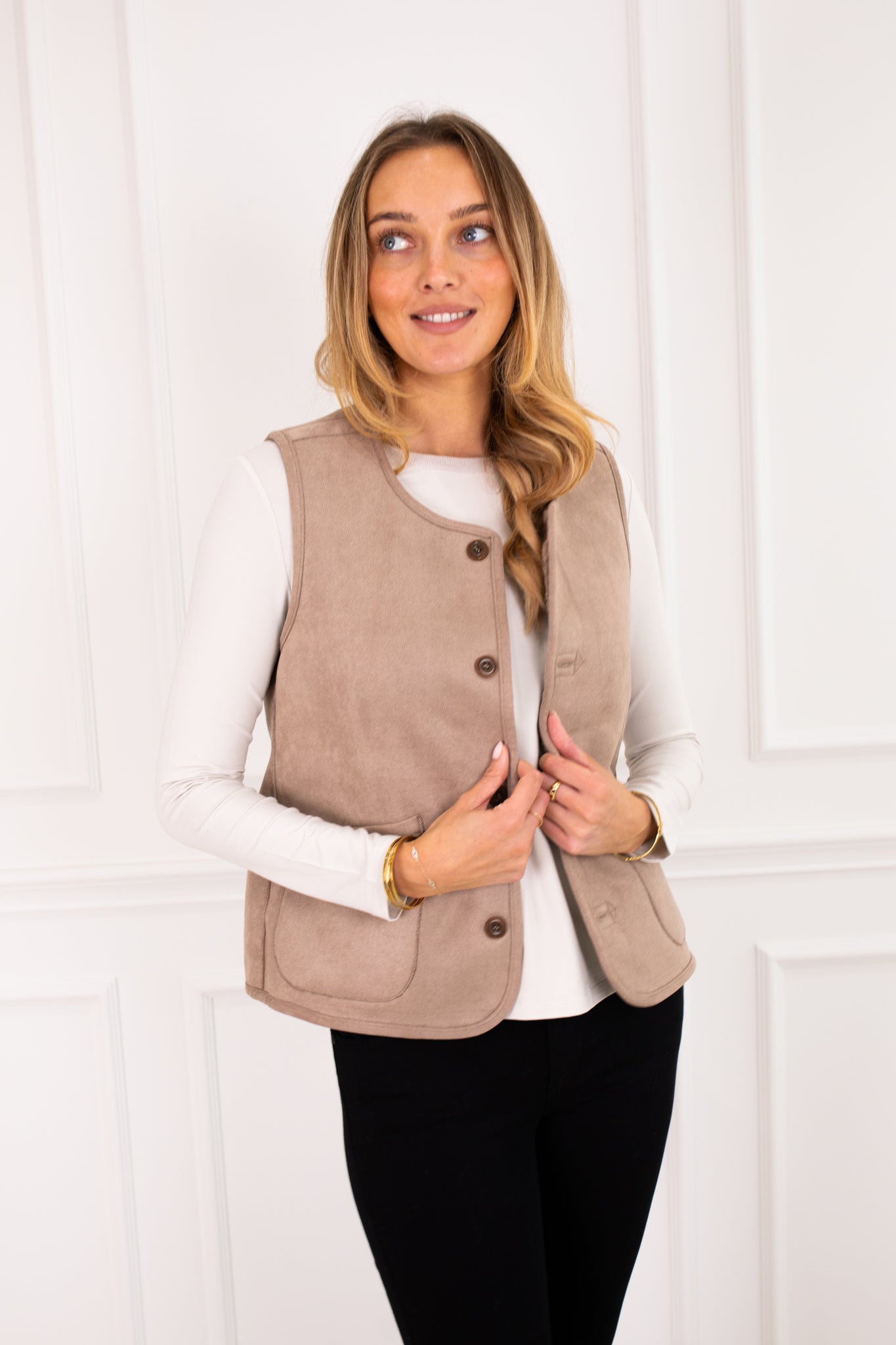 Neutral, long sleeve layering piece in a luxurious stretch fabric with contrasting knitted detail to the neckline. The neckline features tiny, clear sequin adornments. This staple style is an essential for every wardrobe, perfect for layering throughout the seasons.