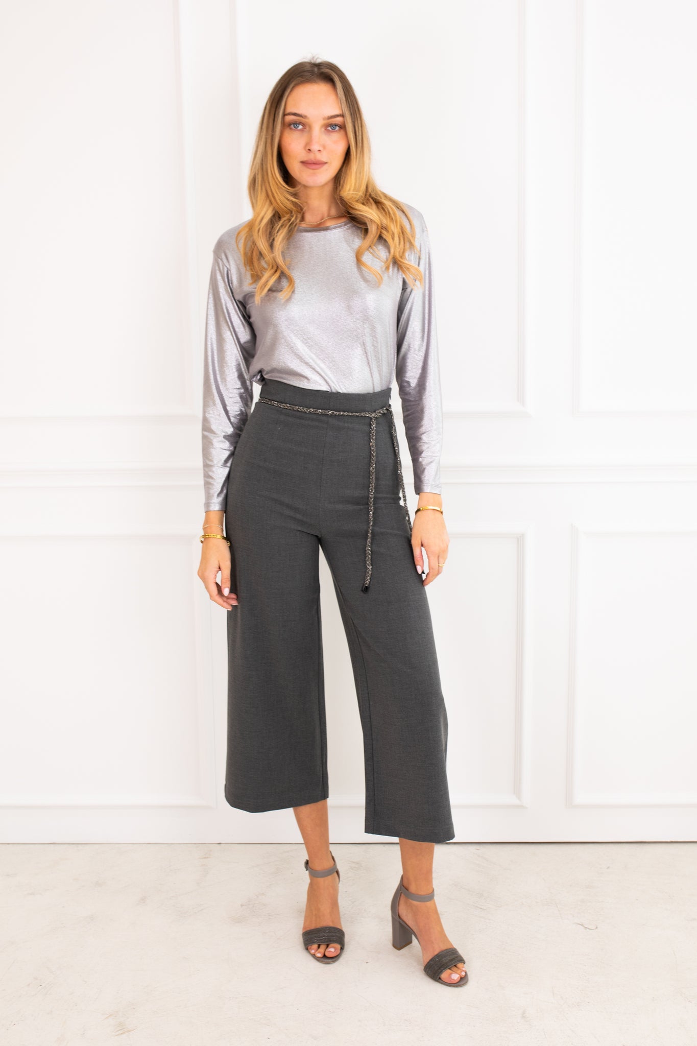 Long sleeve t-shirt in a shimmery pewter colour. This close fitting style is perfect for layering under gilets and sleeveless jumpers and elevates the look with its sparkles.