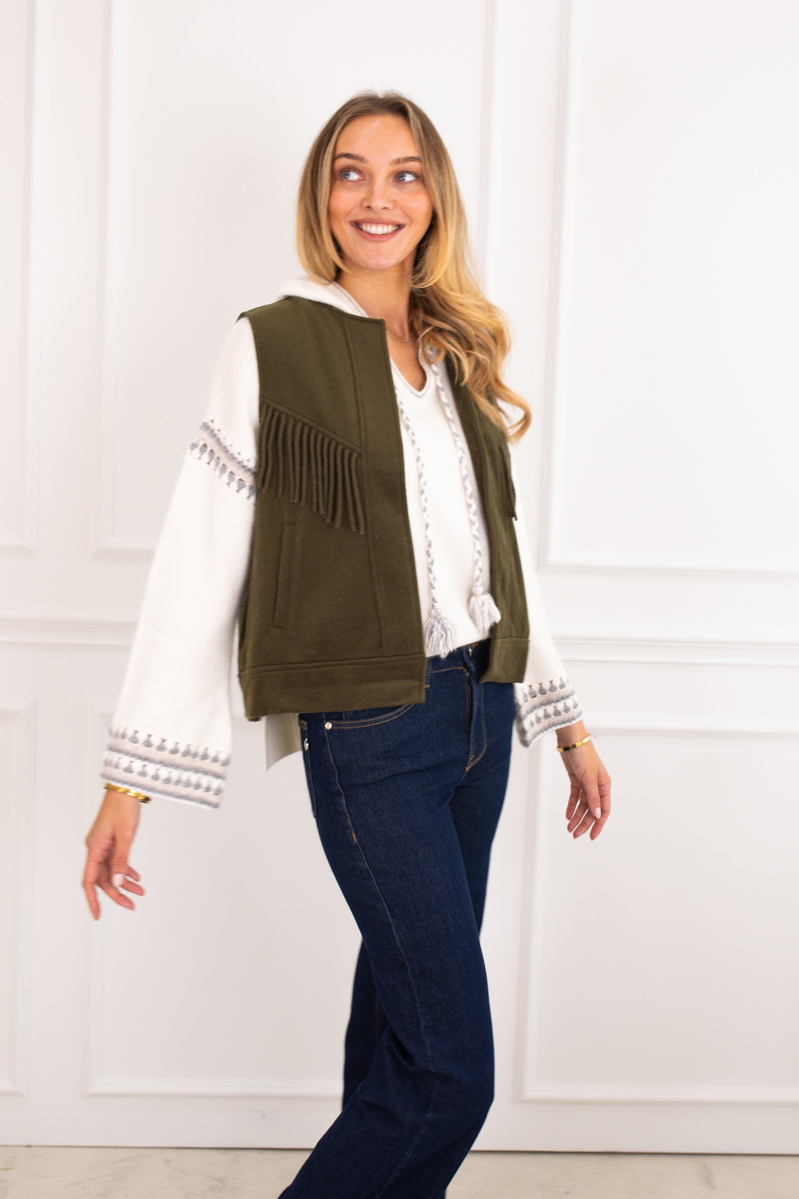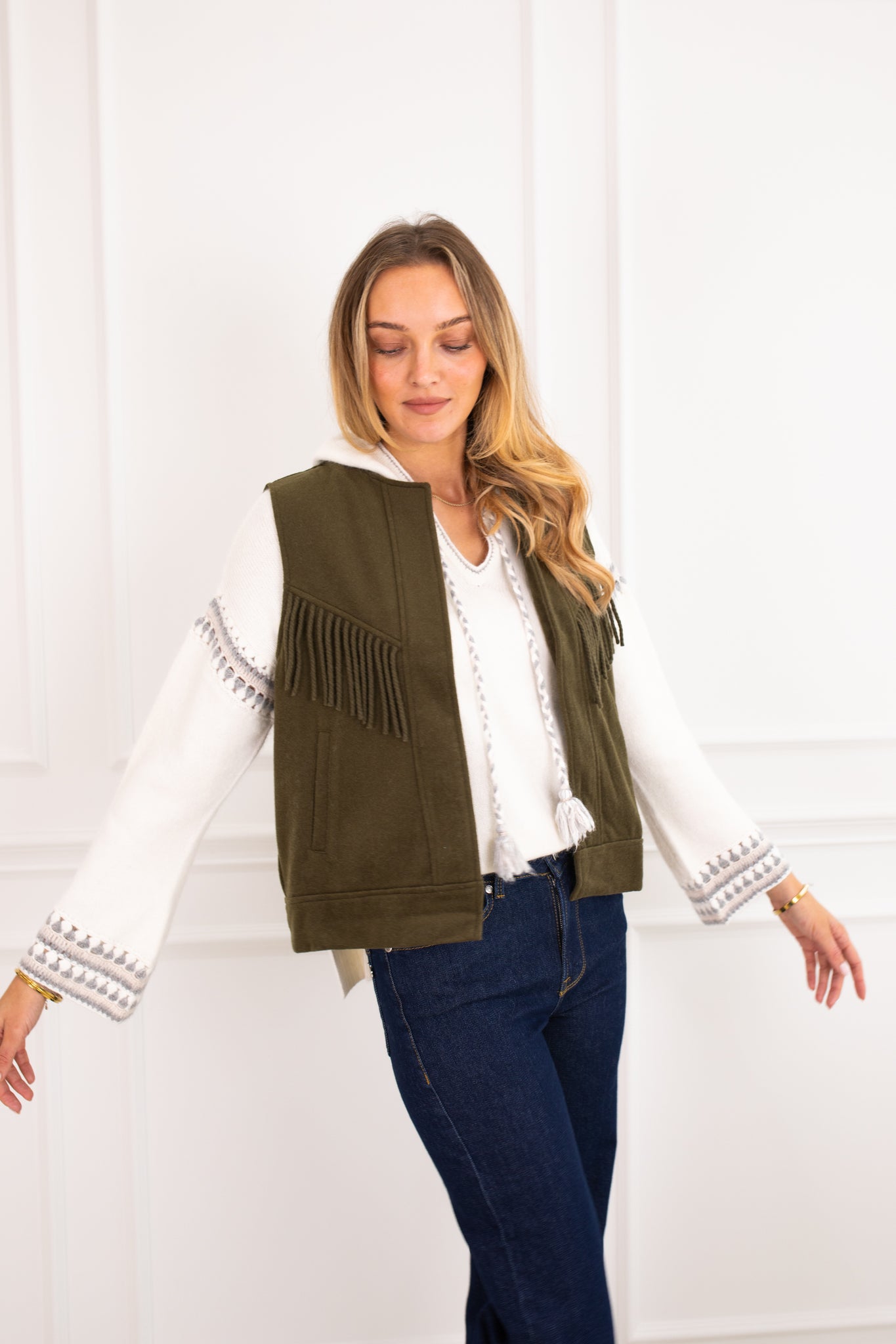 Khaki wool waistcoat with tassel detailing throughout. A fun layering piece which will add some personality to any outfit, style it layered over blouses or knitwear. This style has two side pockets.