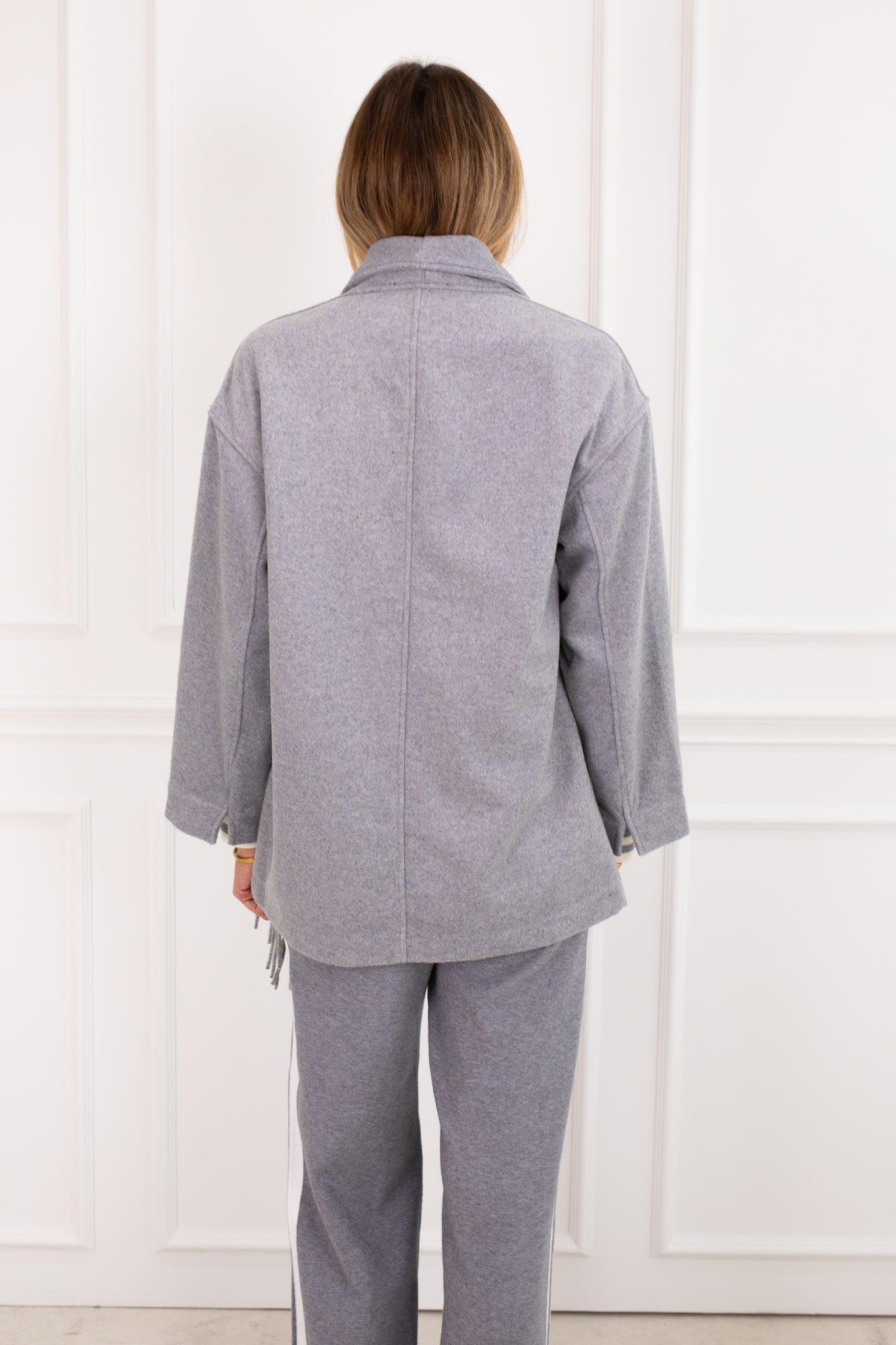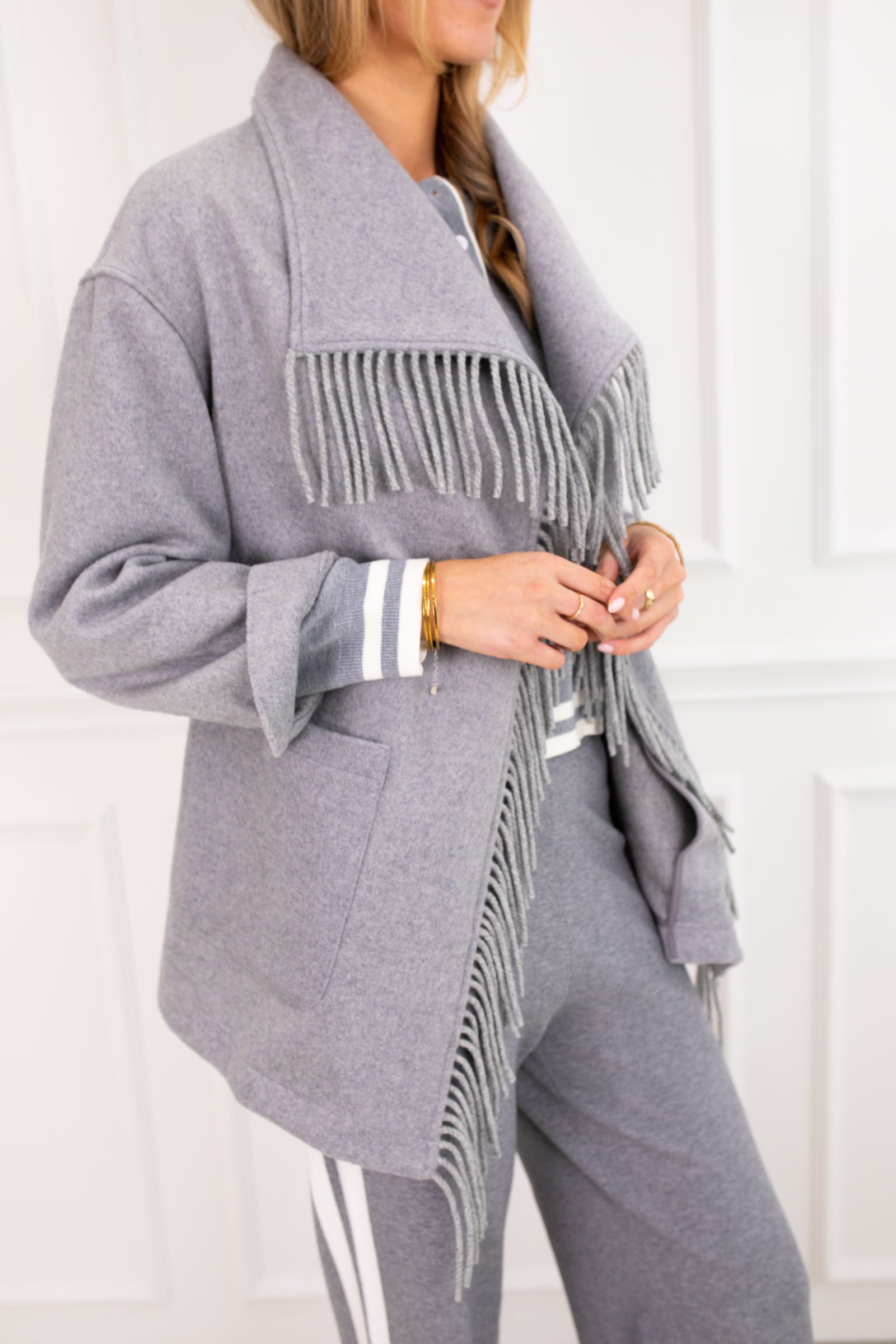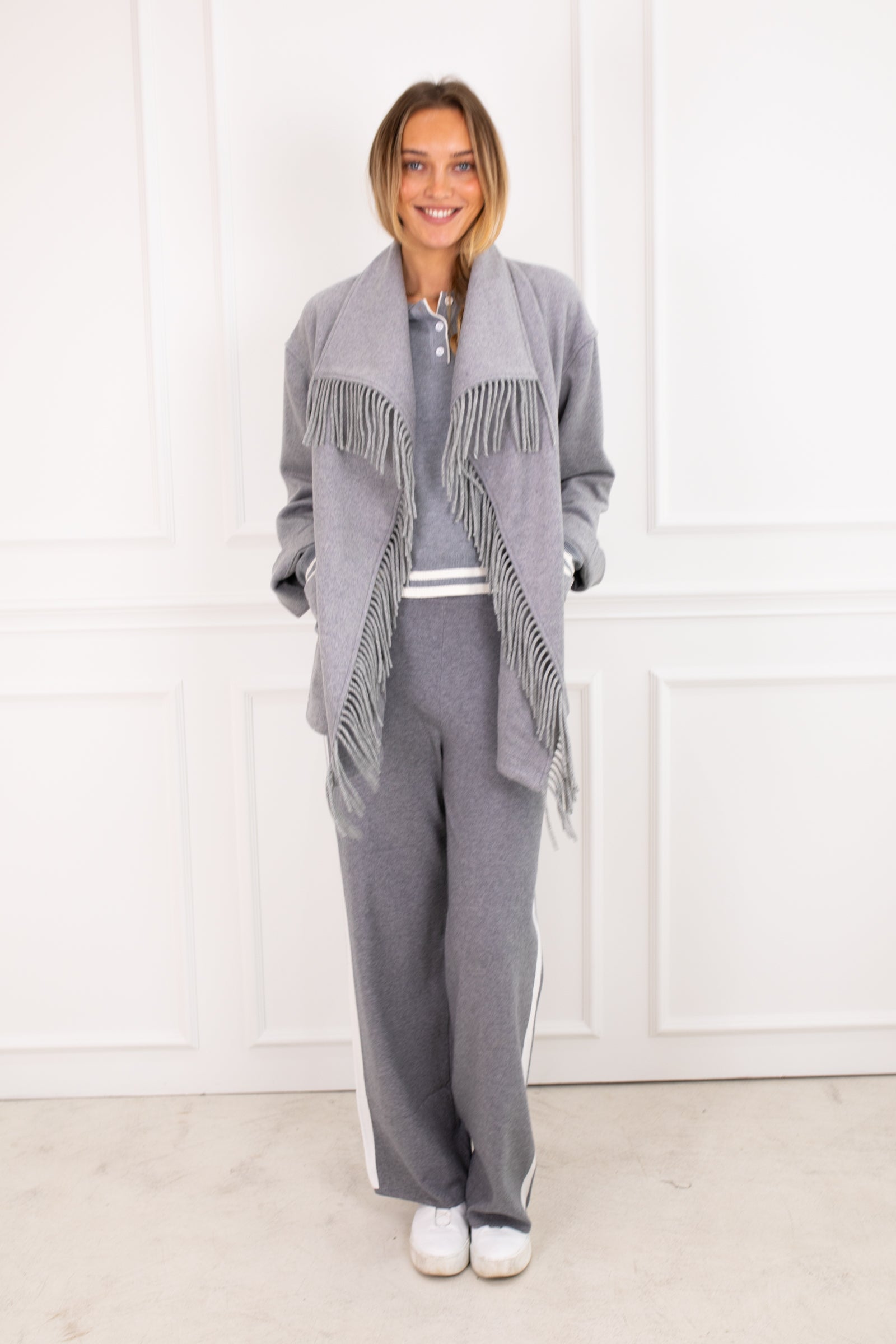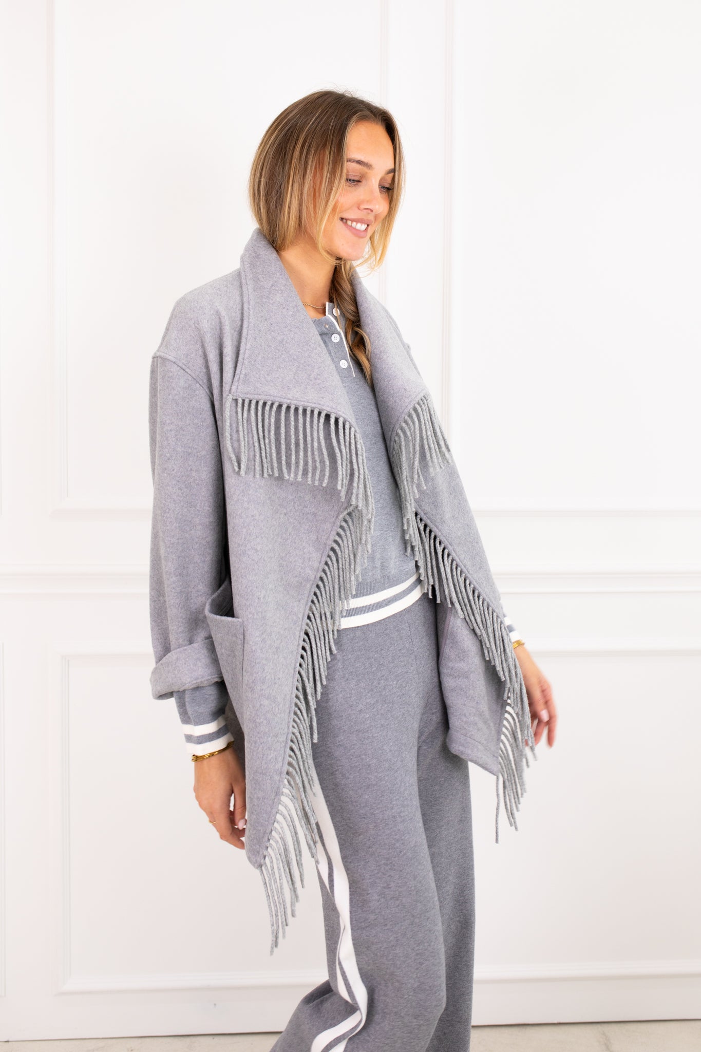 Relaxed wool blend coat with tassel edge detailing. This grey coat has wide sleeves and feature front pockets. Dress it up over occasionwear or dress it styled down over all your casual outfits.