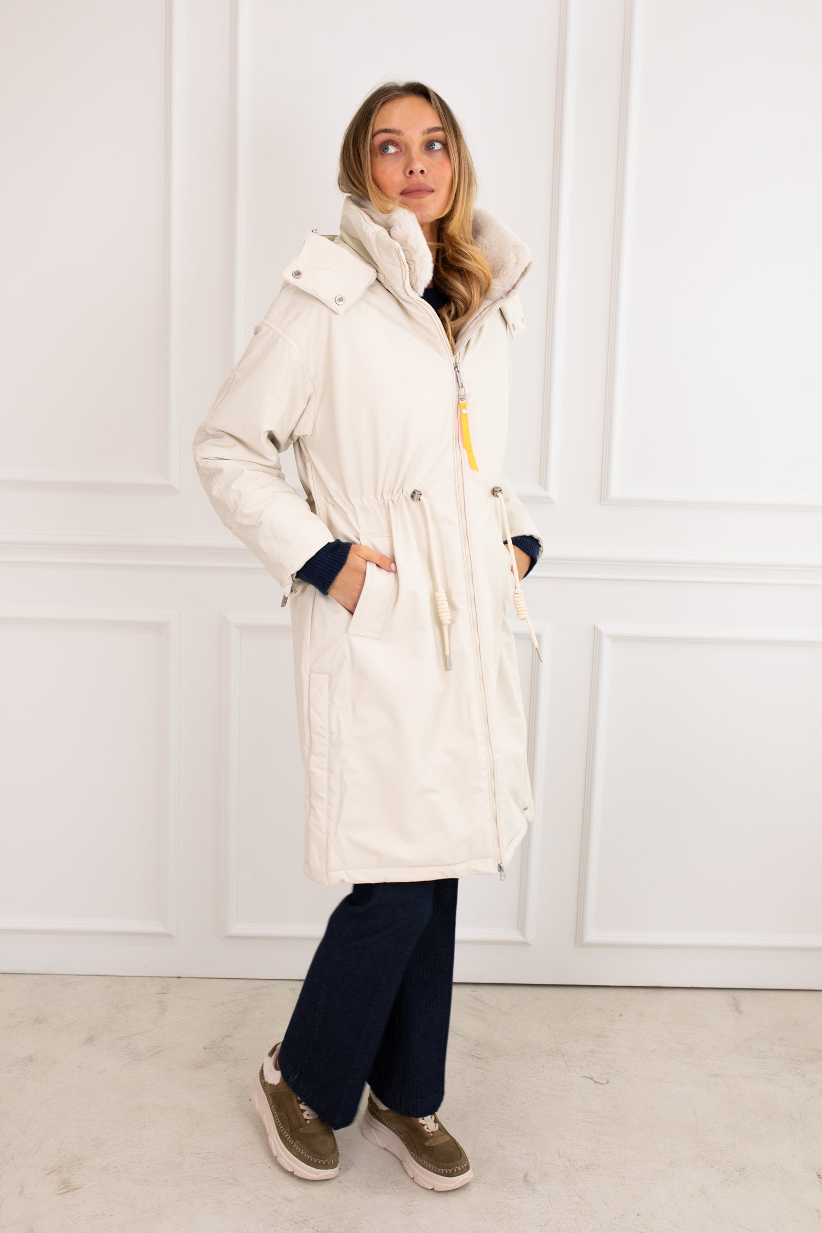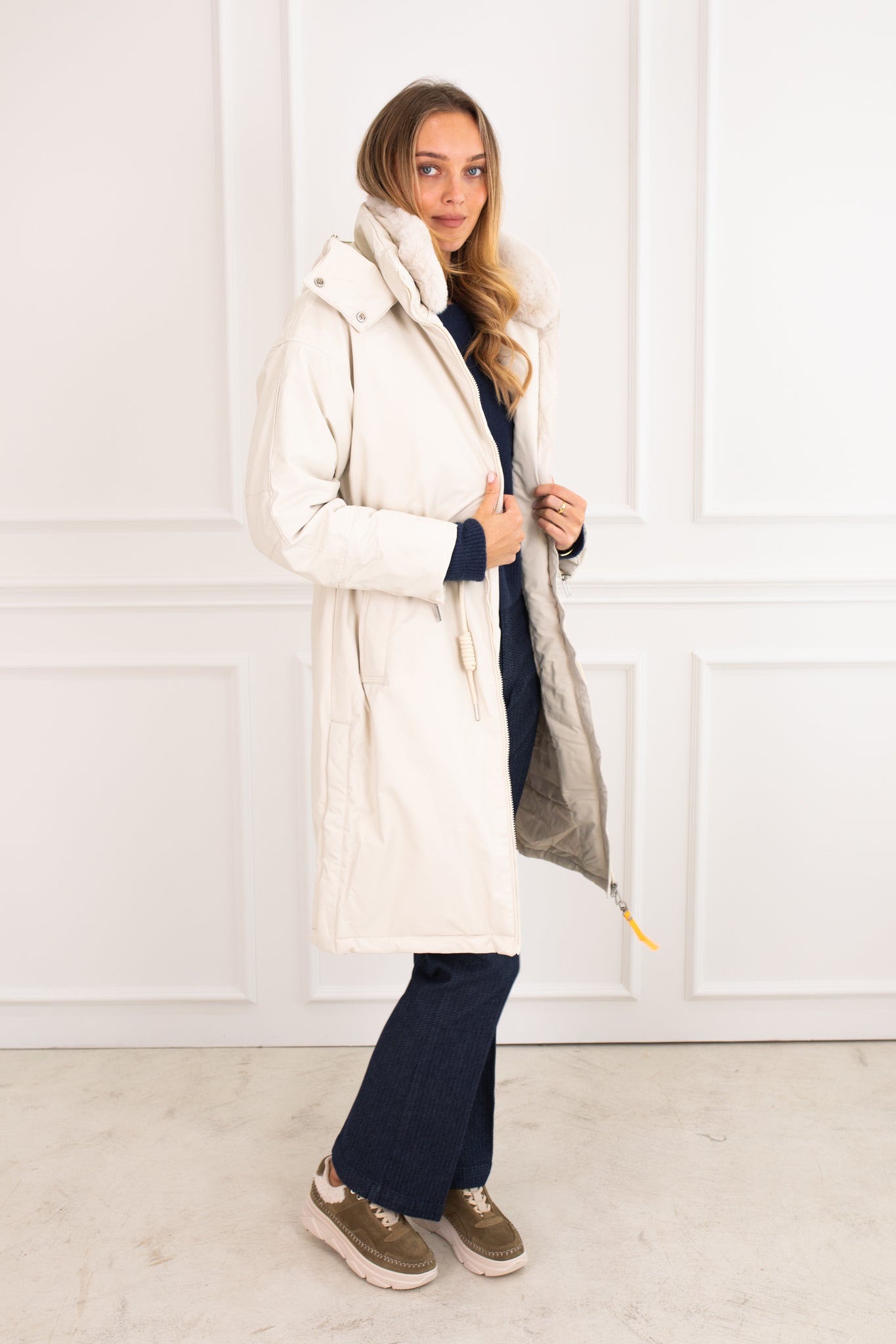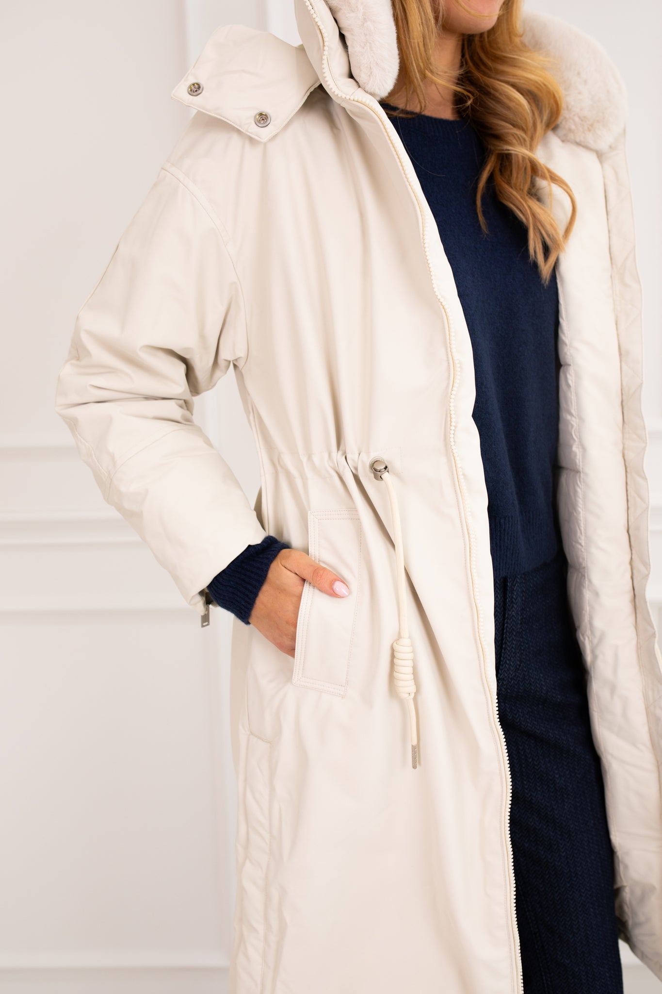 Bundle up in this long padded coat made from a structured material - a versatile winter essential. This coat features a removable faux fur collar, two-way zipper closure, drawstring waist, removable hood with drawstrings, and side slits with push buttons. Stay stylish and warm with this functional yet fashionable outerwear piece.