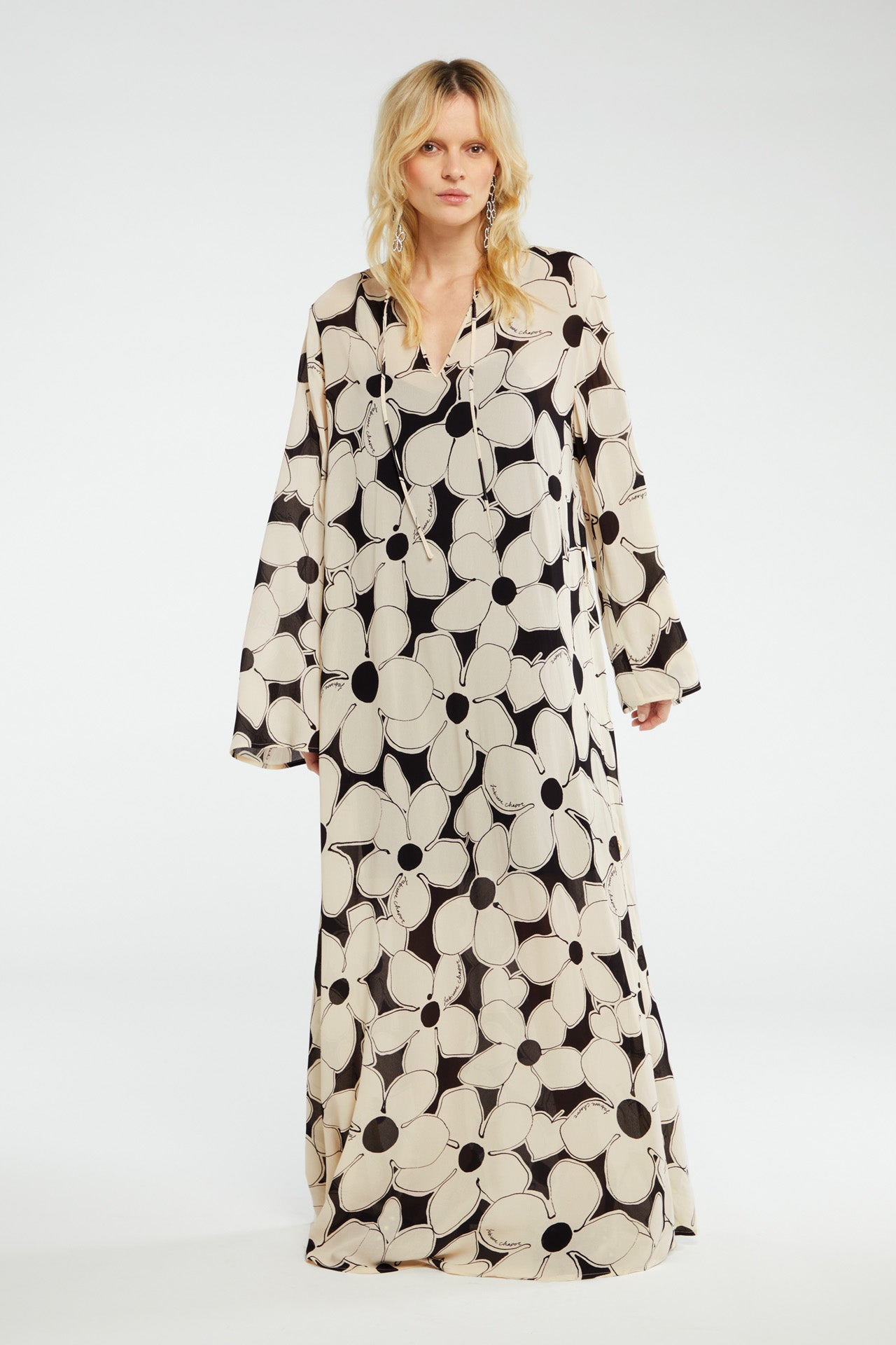 Long black and cream flower print dress with side slit up the skirt. Long sleeves and round neck. Small button closure at the back. Co-ordinating self tie belt to add definition to the waist.