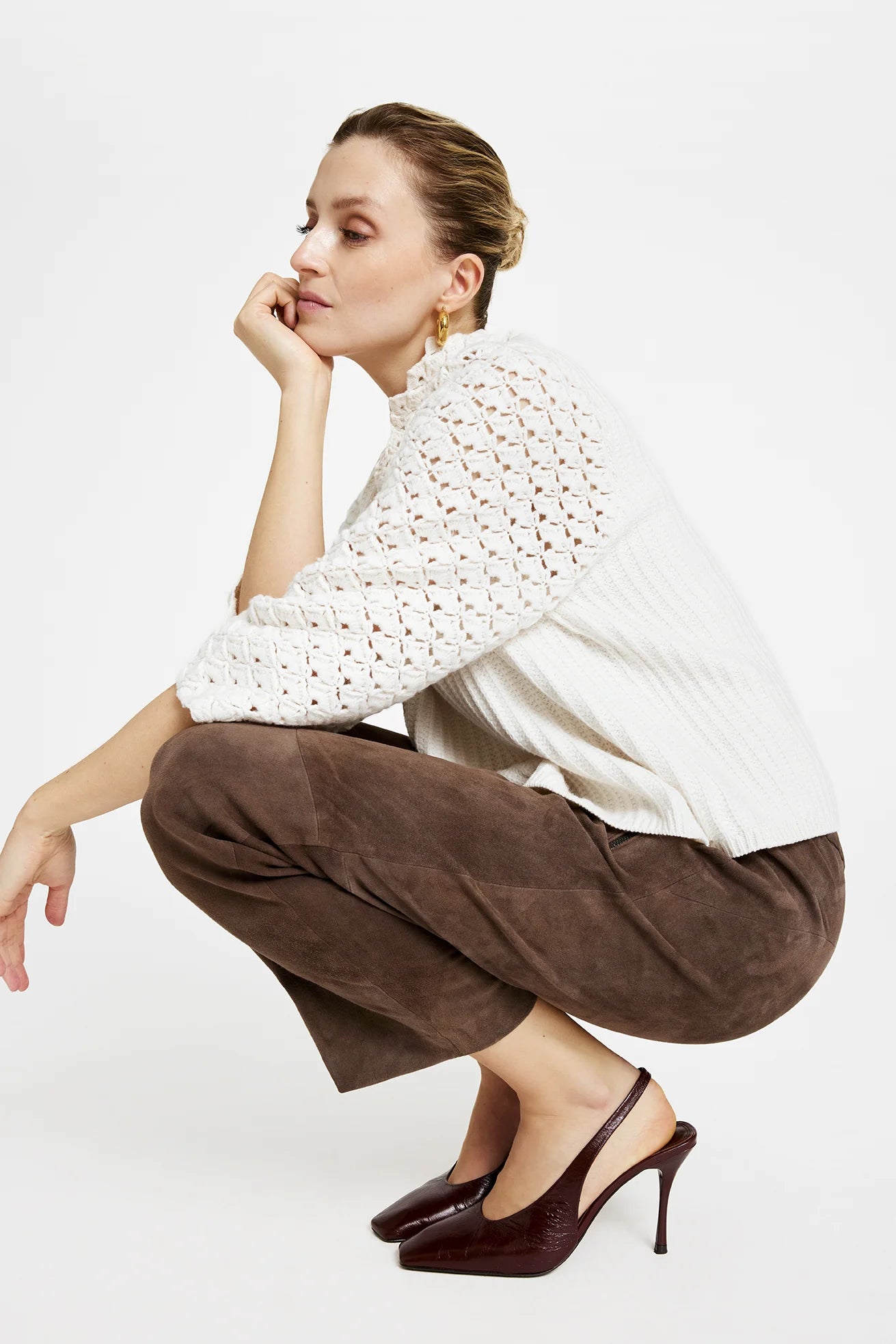 Cream sweater with crochet sleeves and collar contrasting with a ribbed, knitted body. This style has 3/4 length sleeves and a boxy fit. Perfect for pairing with tailored trousers or slim fit jeans.