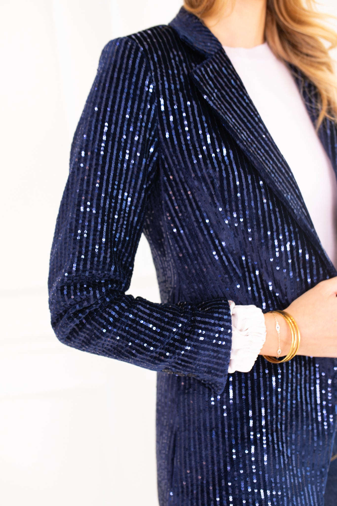 Midnight blue sequin blazer with a single button closure. Style it with the co-ordinating Vance Trousers. This jacket is lined with a signature Vilagallo print.