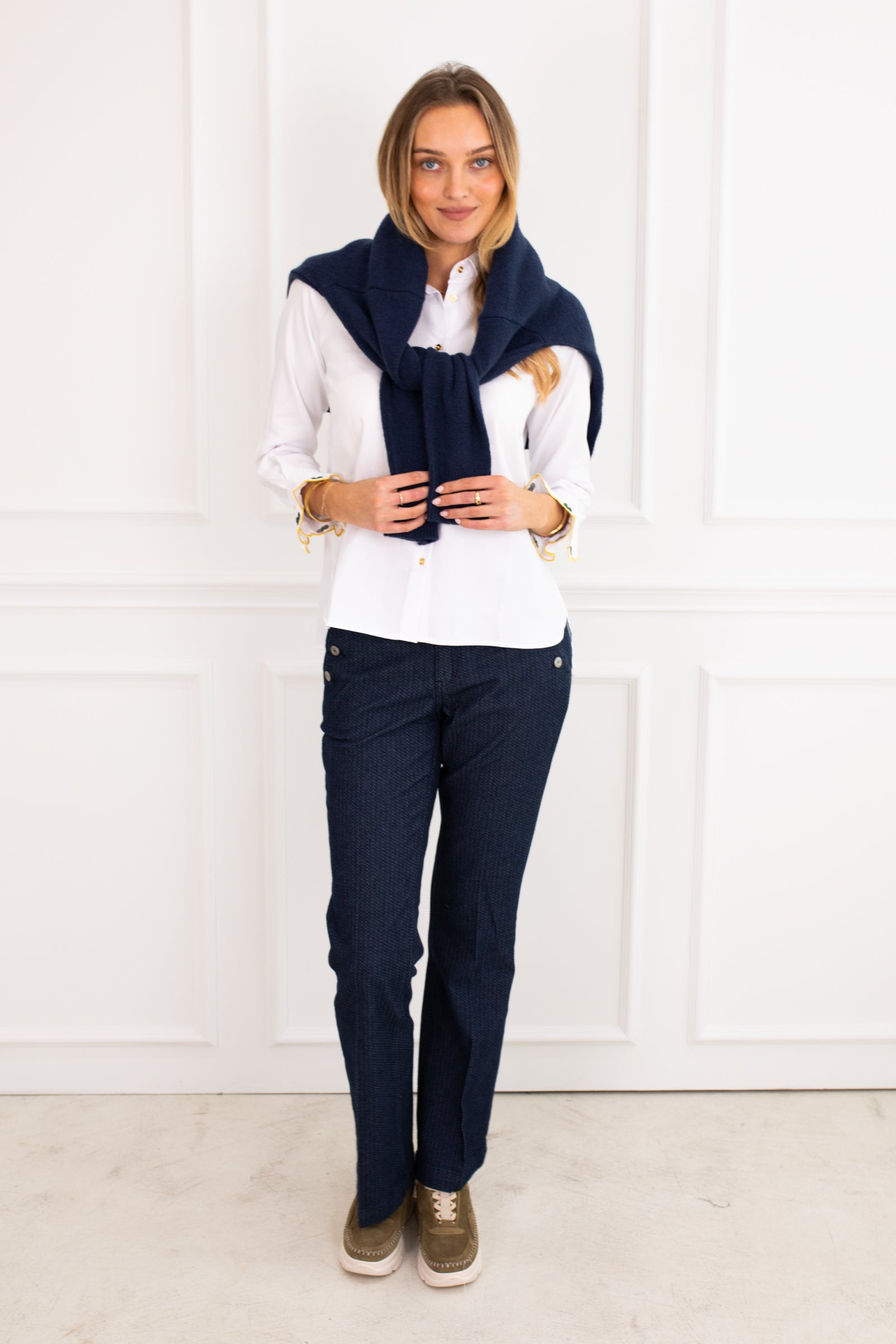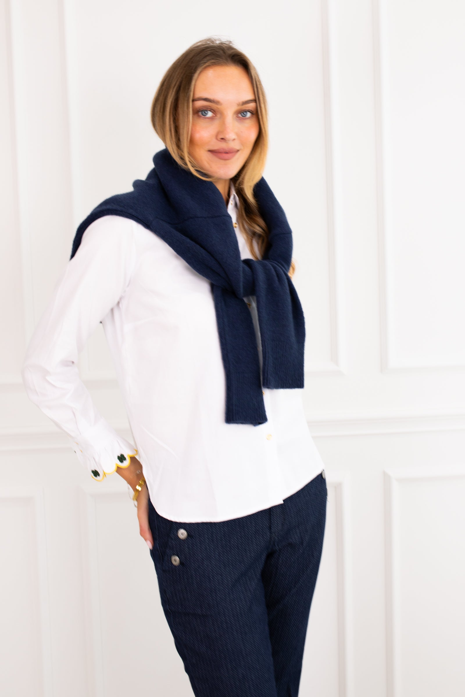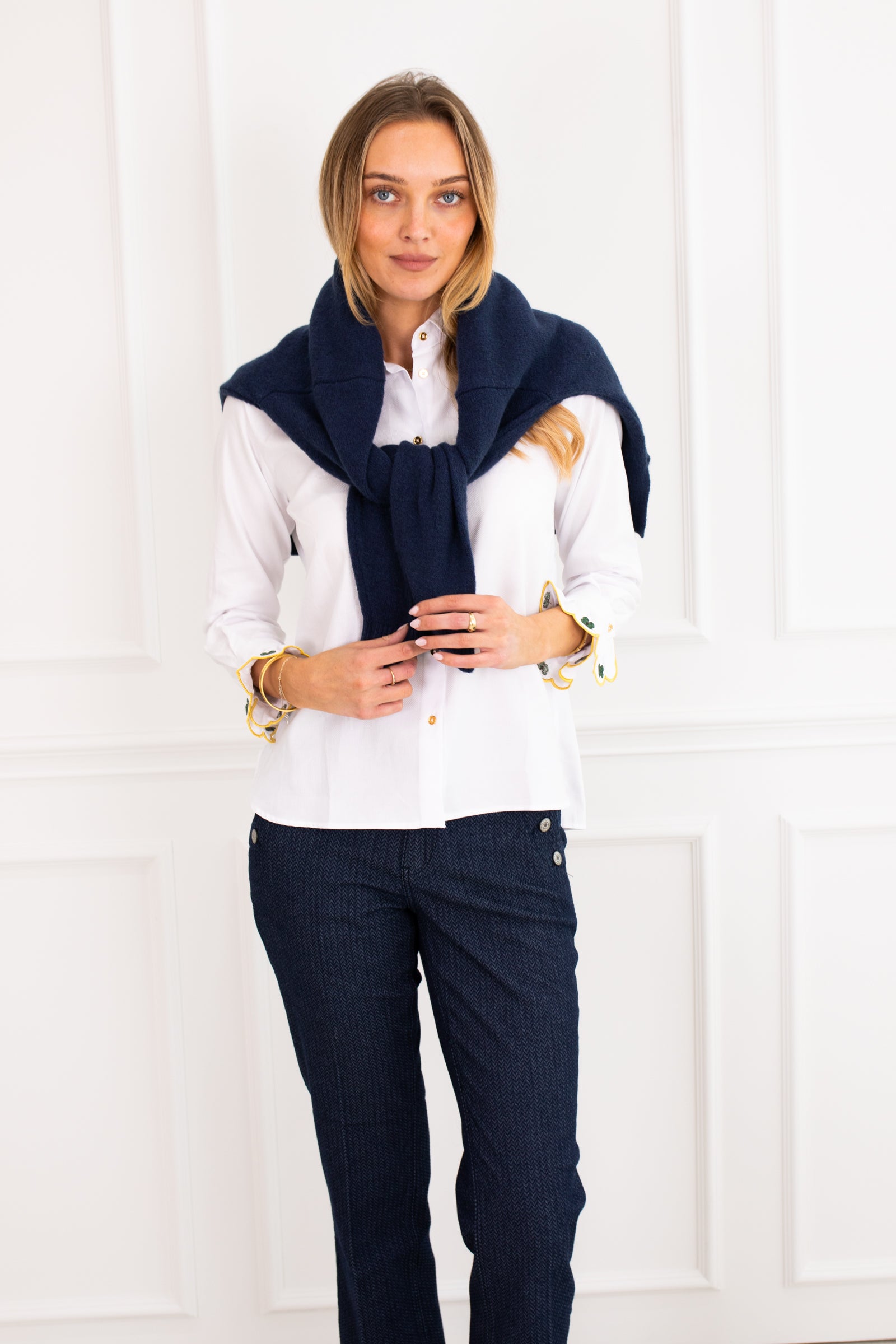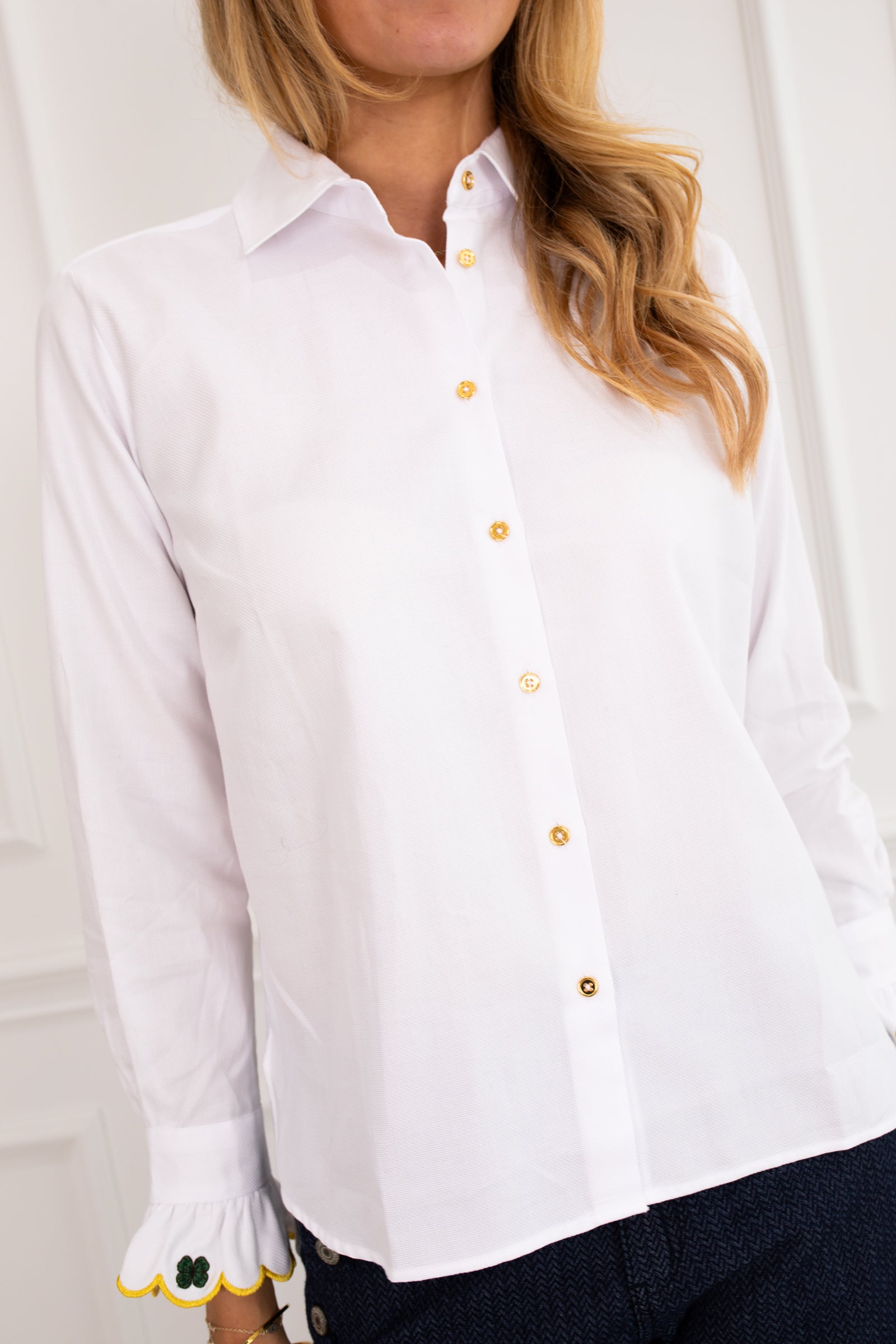 Straight-cut white shirt with classic collar and visible gold buttons. The standout detail is the frilled cuffs, decorated with green clover embroidery and yellow scalloped edges. A red embroidered message appears at the back of the collar. The hem is straight. Made from structured, textured fabric.