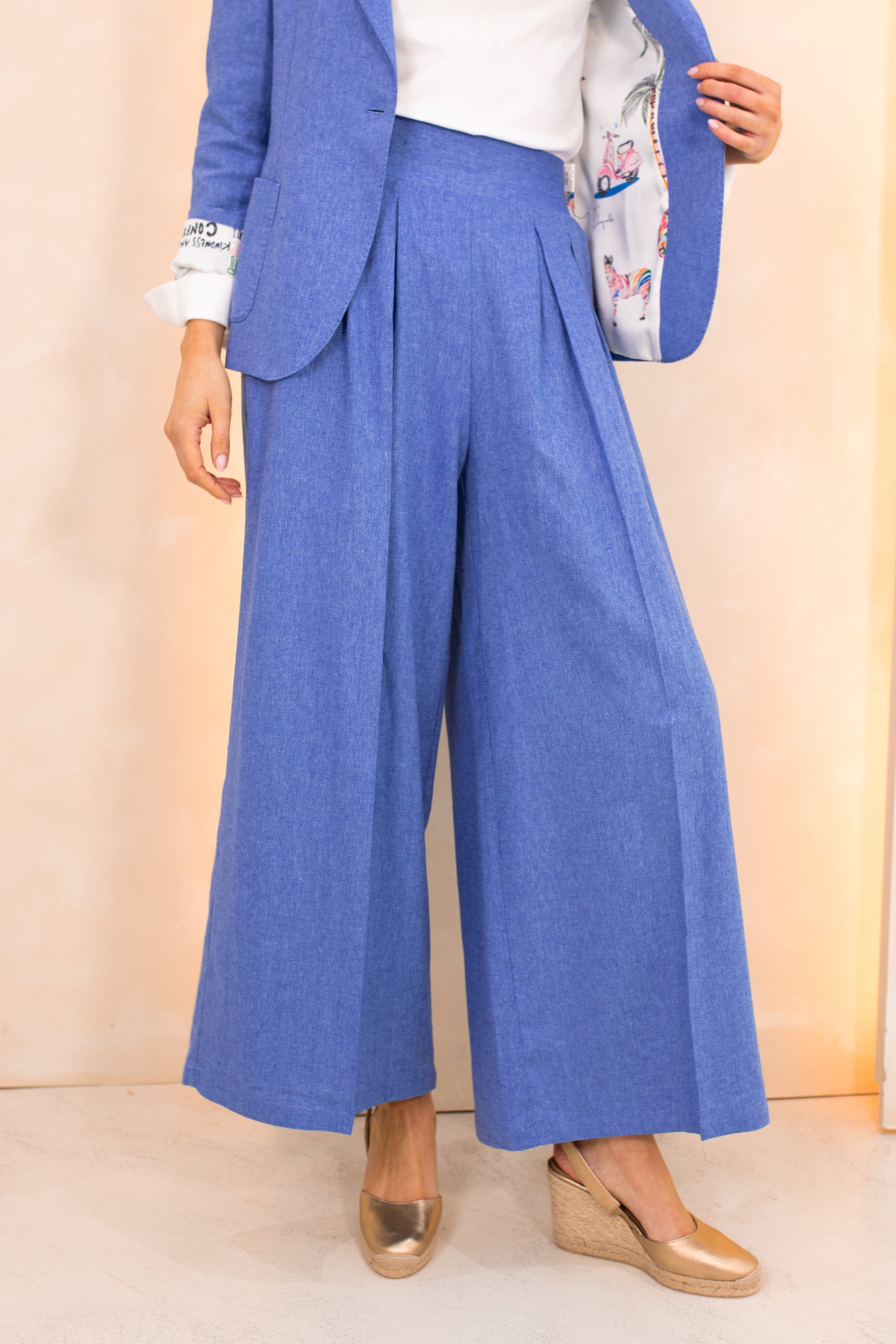 Blue wide leg, high waisted trousers in a chevron woven linen blend fabric. This style has pleats to the front, a wide waistband and two side pockets. The elasticated band makes this style super comfortable to wear. Style them with the co-ordinating Vale Jacket.