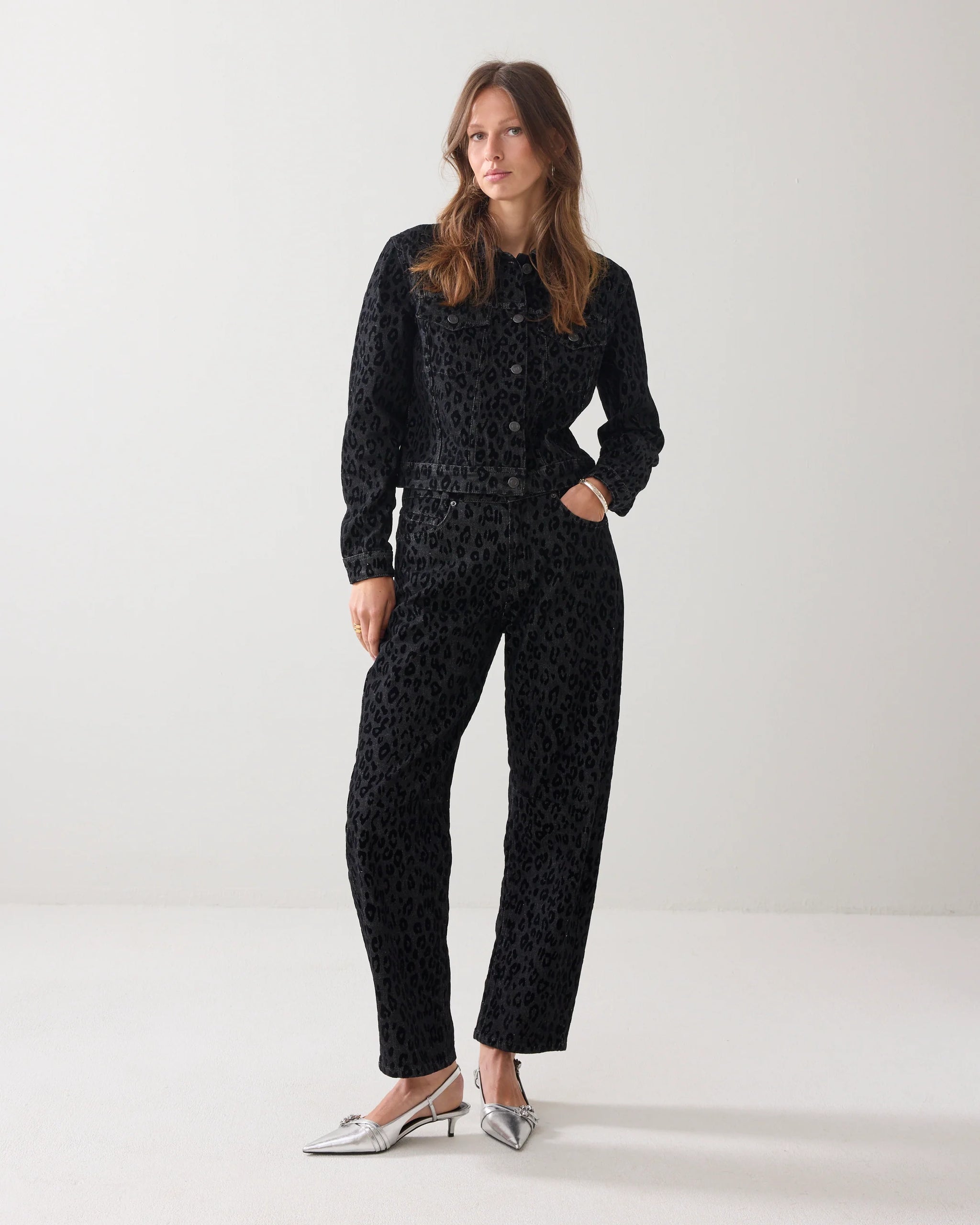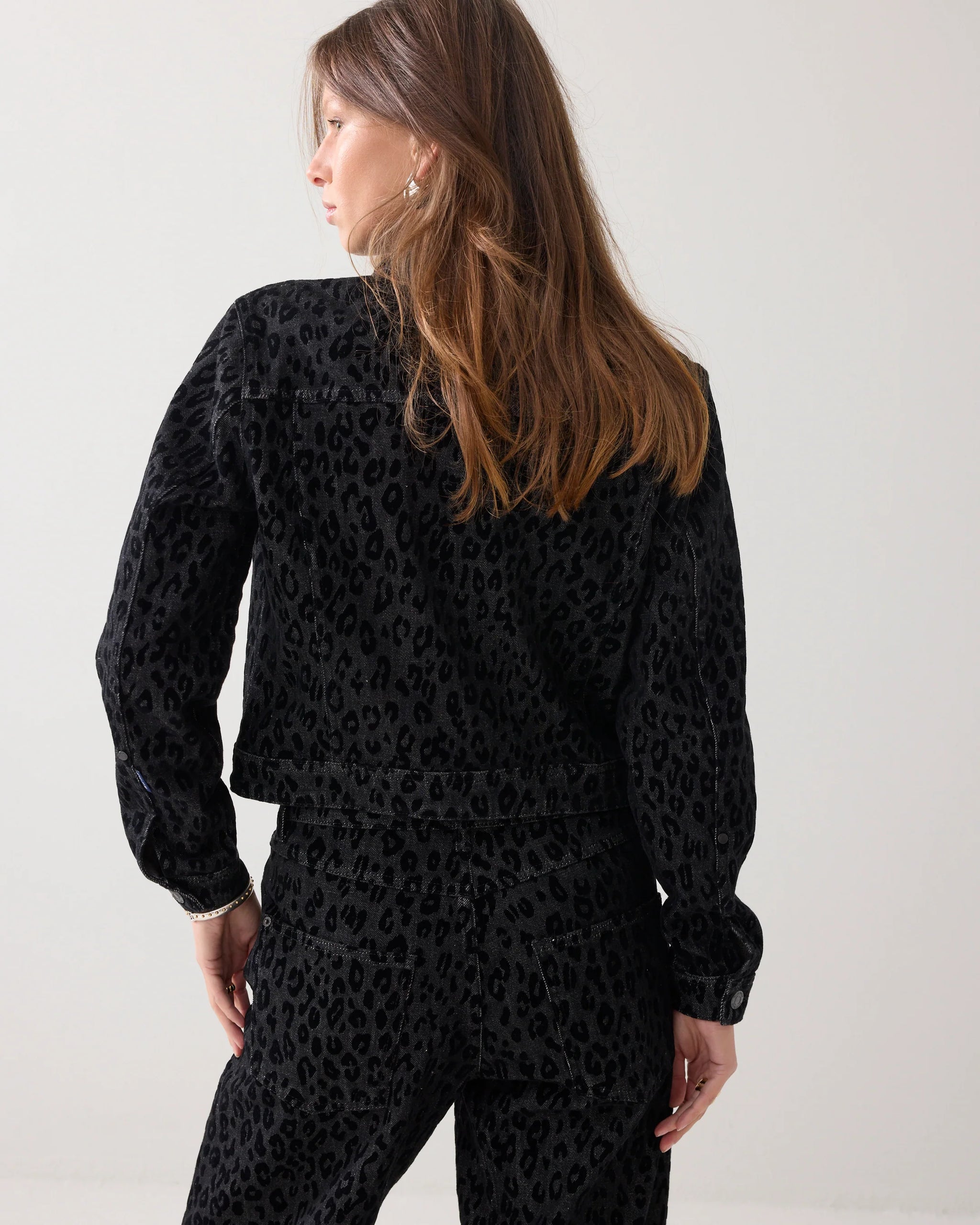 Classic denim jacket with black with a velvet leopard print pattern throughout. This jacket has a regular fit and flap pockets at the front. Style it dressed down with jeans or style it layered over your party dresses.