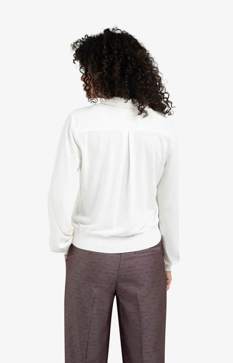This stylish jersey blouse features a soft shirt collar, long balloon sleeves, and a button-down front. The design includes a double layer effect that creates the illusion of a layered cardigan over a blouse. Finished with ribbed cuffs and hem for a comfortable fit. A refined piece that adds depth and character to your look