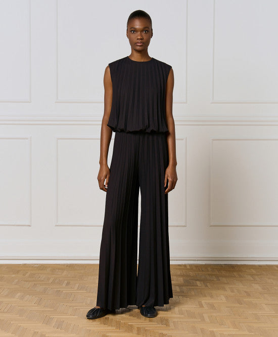 Sleeveless pleated crop top with round neckline and balloon hem. Pair it with the matching Austin Trousers for a beautifully elegant look.