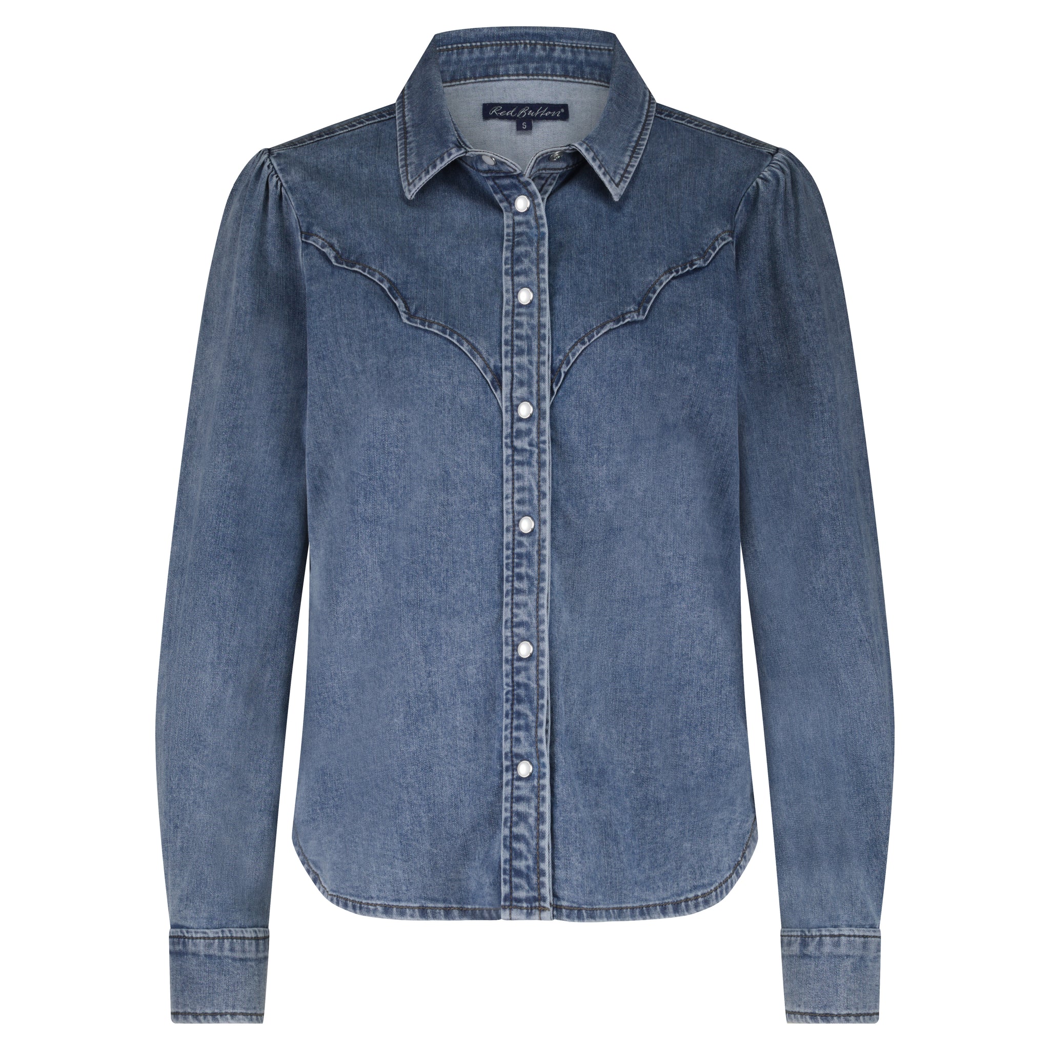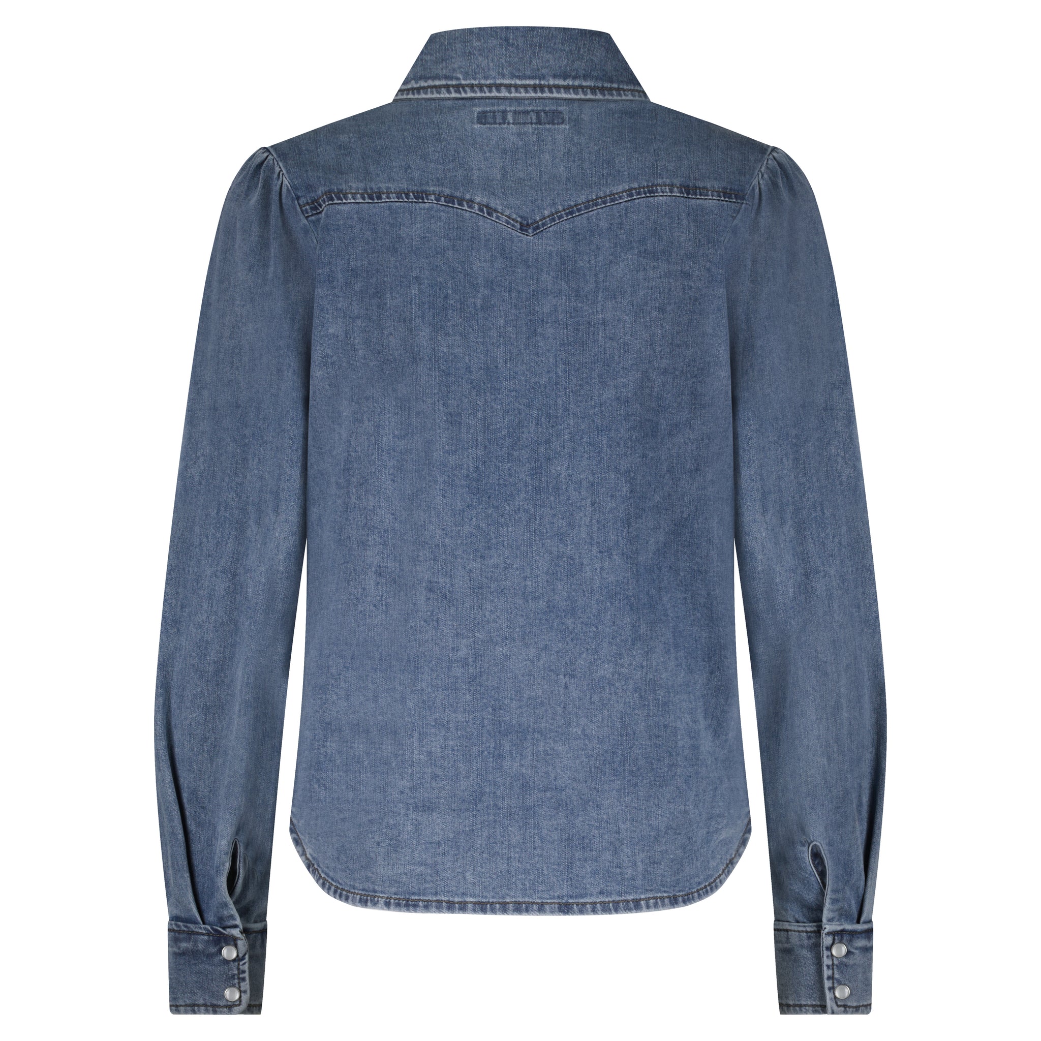 Long sleeve denim shirt in a medium blue wash. This style features western style details and pearl style buttons.