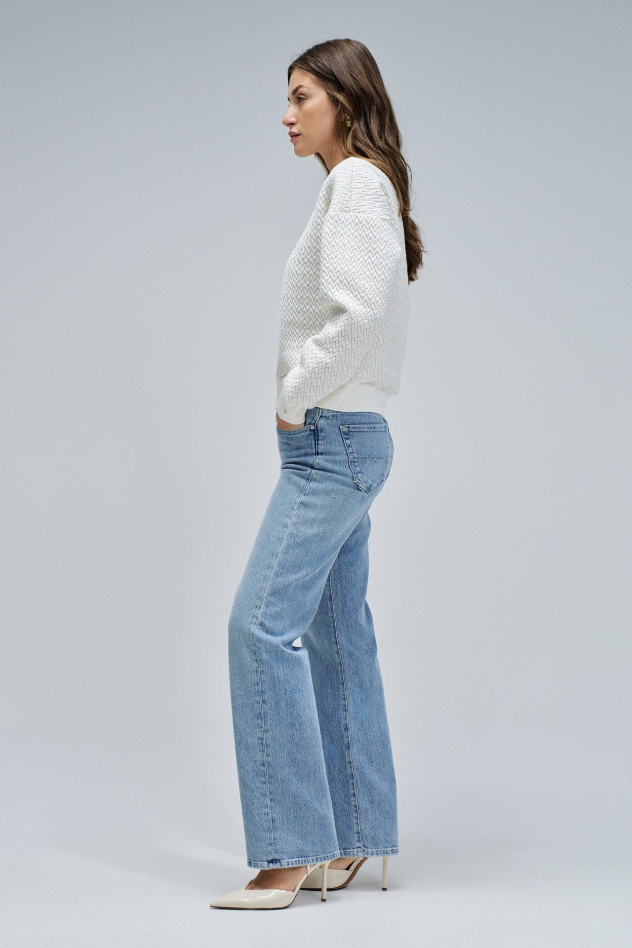Jacquard sweatshirt in off white with a regular fit that ensures comfort and versatility. The fabric features an all over zig-zag stitch design in a contrasting gold metallic thread.  This style has long sleeves, a classic round neckline, and a careful finish that makes it ideal for casual or more sophisticated combinations.