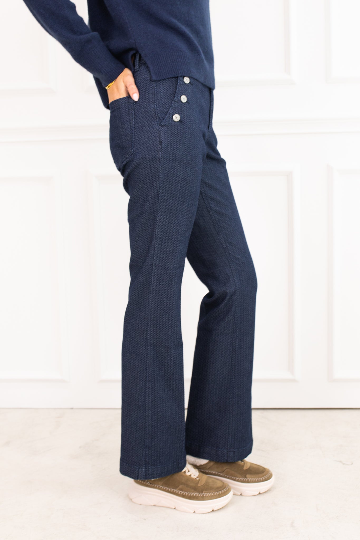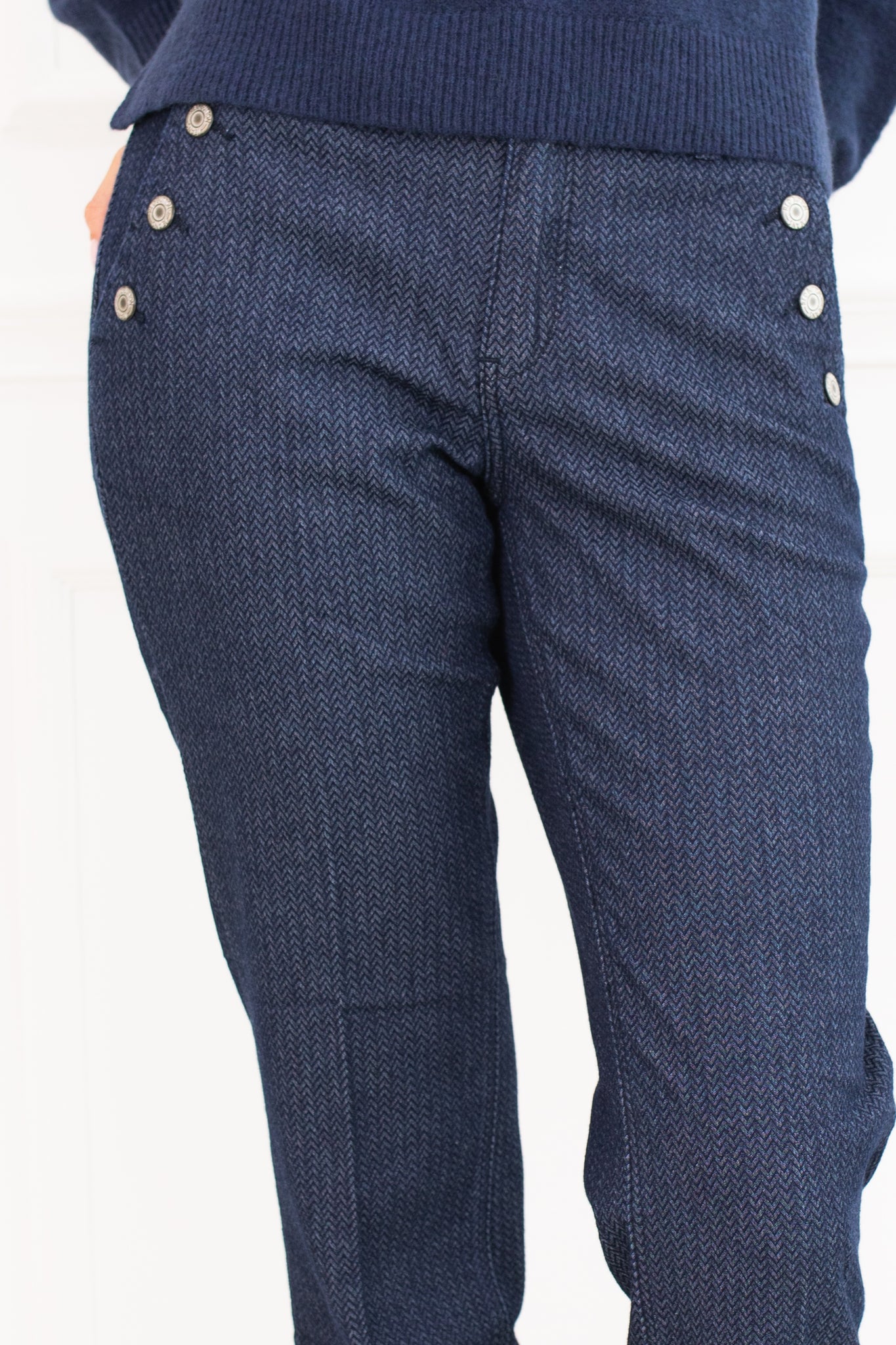 Straight leg navy jeans in textured herringbone denim. This style has feature buttons at the side pockets. A fun take on a classic, you can easily style these jeans causally or style them with a blazer for the evening.