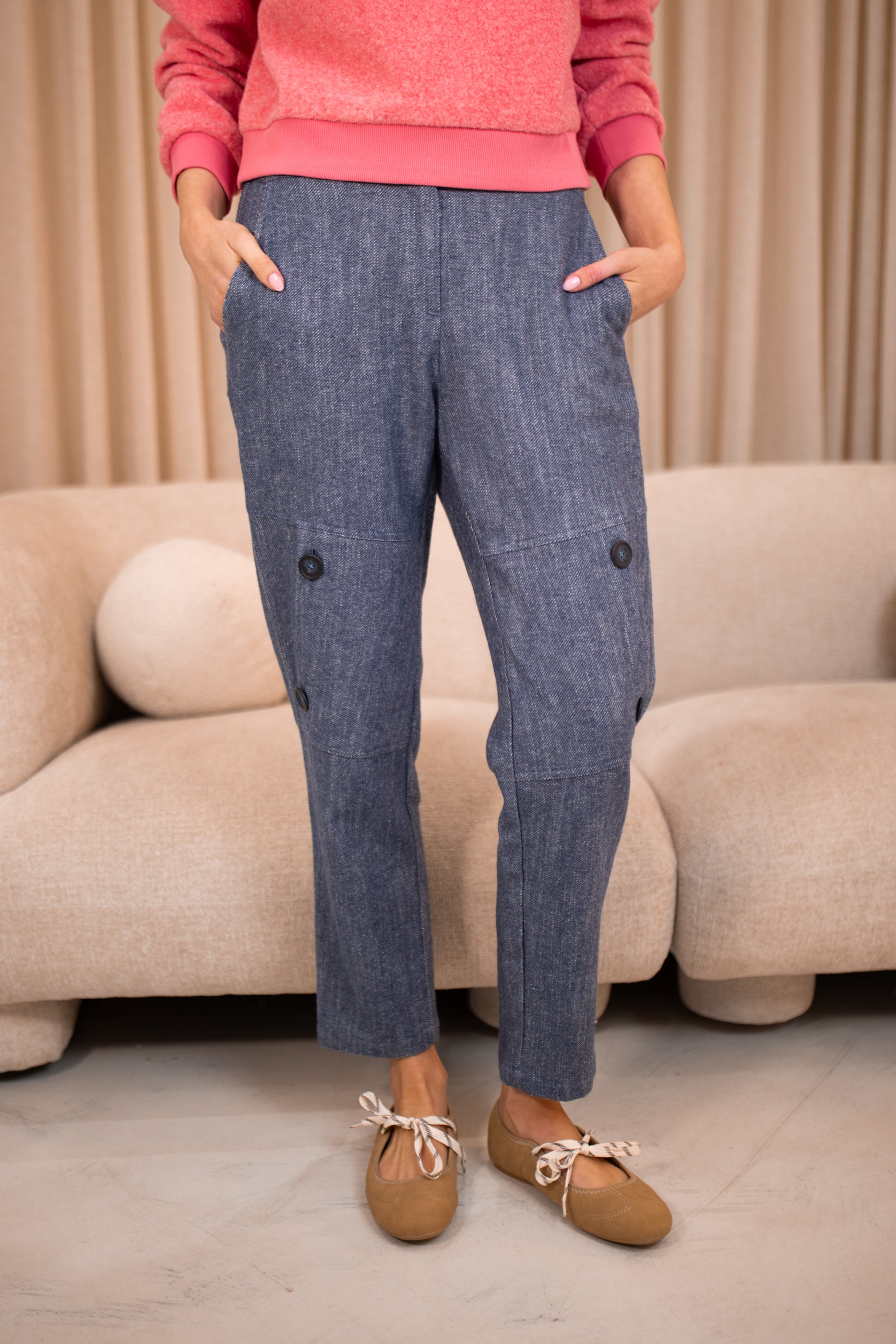 Denim Blue coloured trousers with flecked chunky weave. This style features two decorative patch pockets to the legs. Buttons with a single button and zip closure to the front and two side pockets complete the look. Style them with all your neutral and navy knitwear.