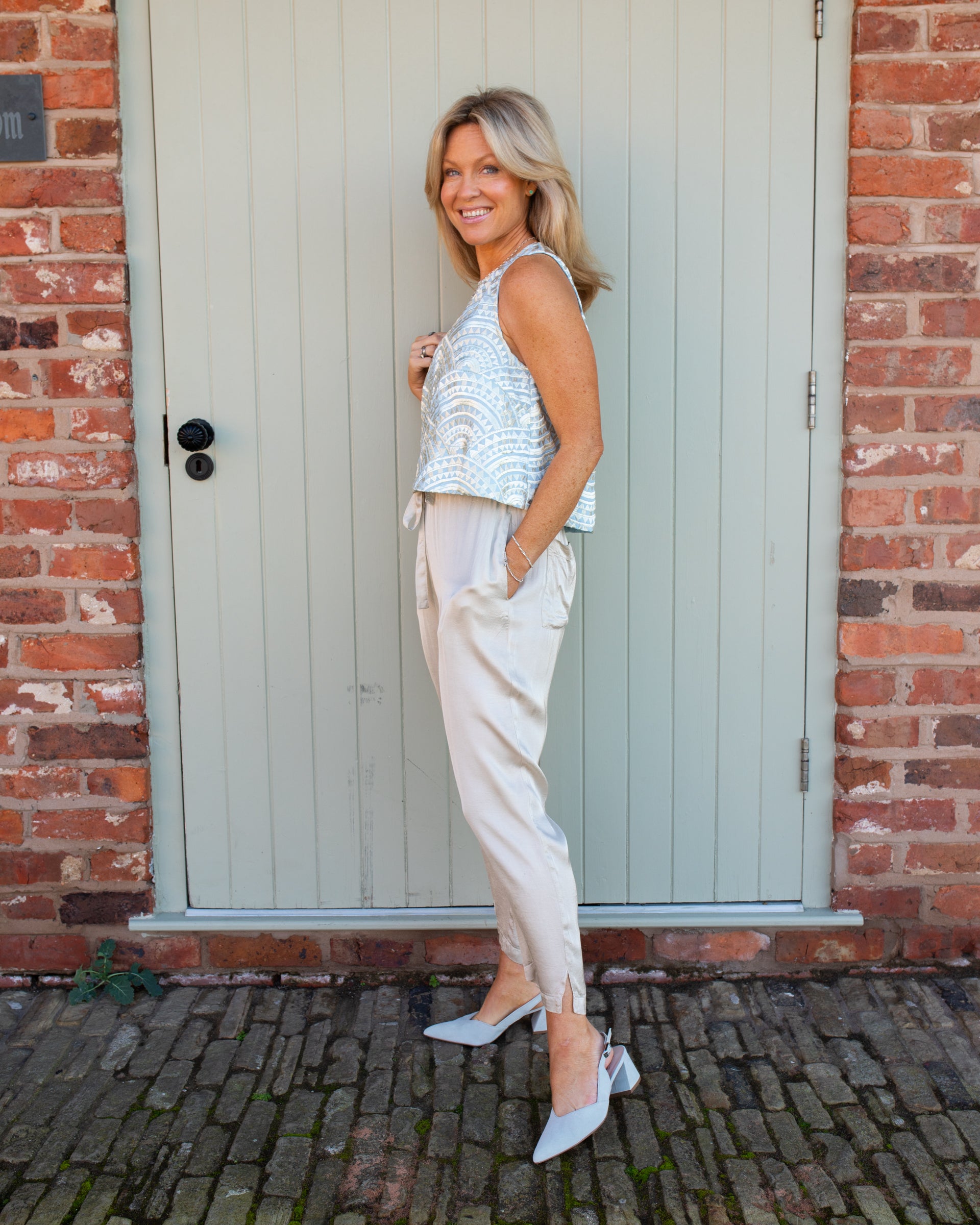 Sleeveless swing top in pale blue with all-over gold embroidery. This style is cropped and has a single button closure to the back. Style it with white jeans or neutral coloured trousers for the perfect summer outfit or wear it on holiday with your favourite neutral shorts.