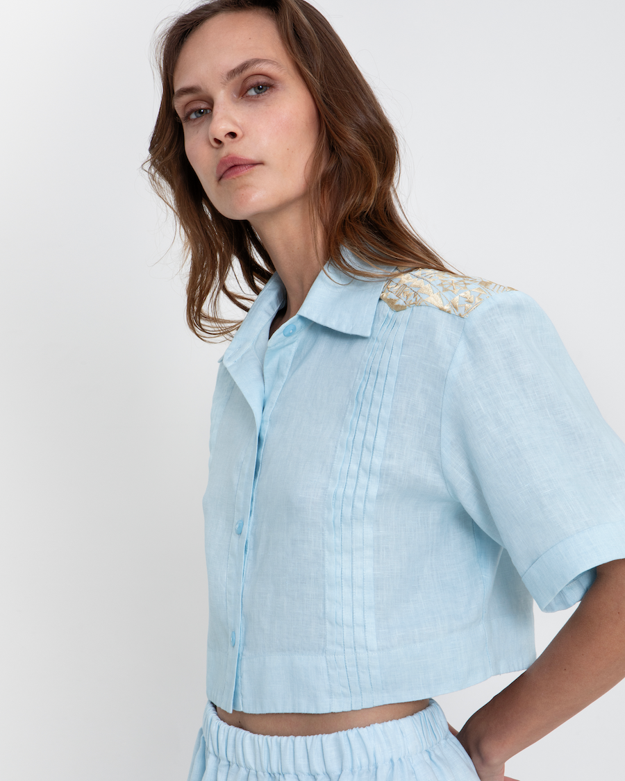 Baby blue cropped linen shirt featuring contrasting gold embroidery to the collar and shoulders. This short sleeve shirt features pintuck detailing to the front. Style it with the co-ordinating Karla Shorts.