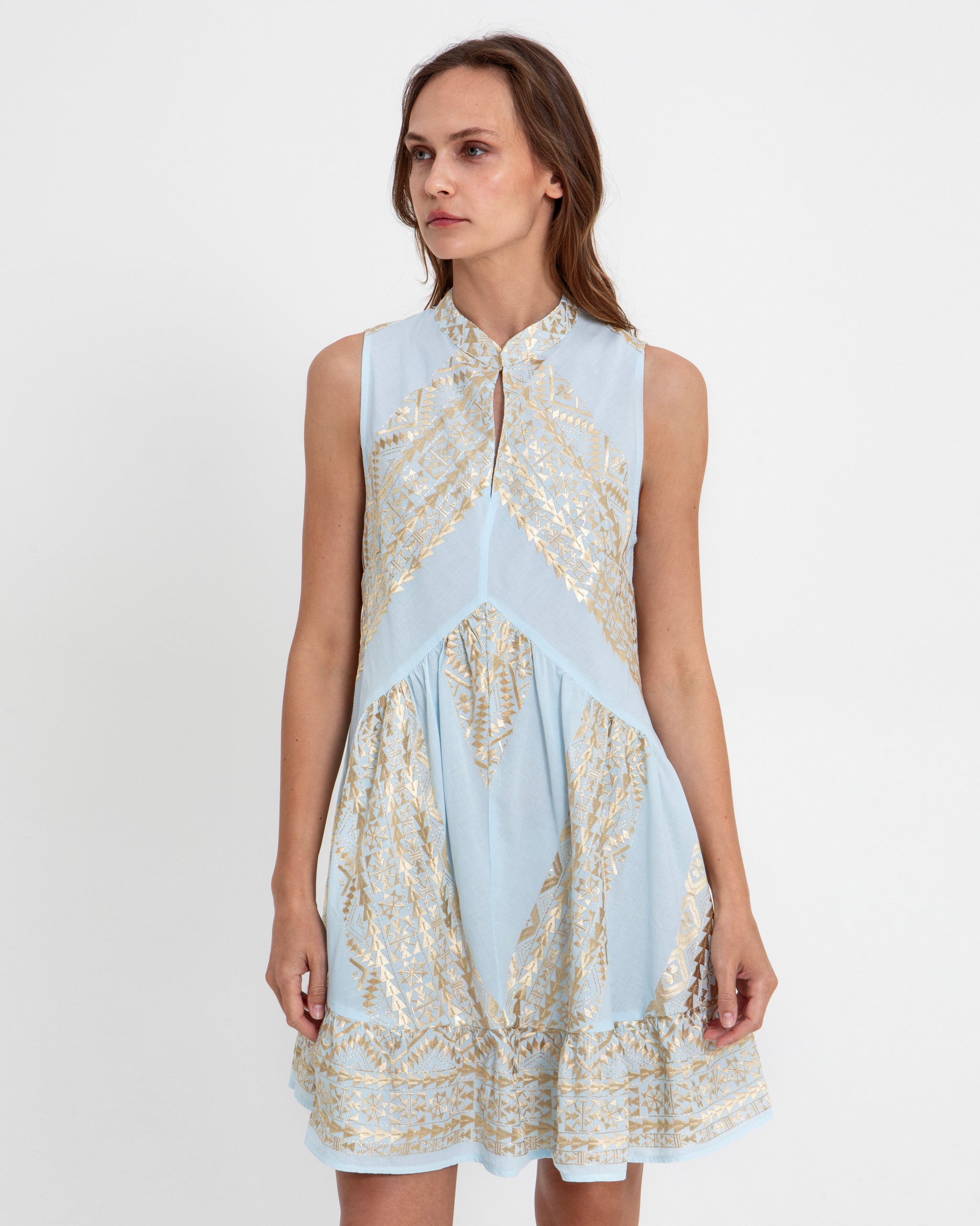 Short sleeveless dress in baby blue featuring contrasting gold embroidery. This style is collarless and has beautiful gathered detailing to the waist, the voluminous skirt finished with a ruffled hemline. This style is perfect for sunny destinations, dress it up with some espadrille wedges or wear it with sandals for simple elegance.