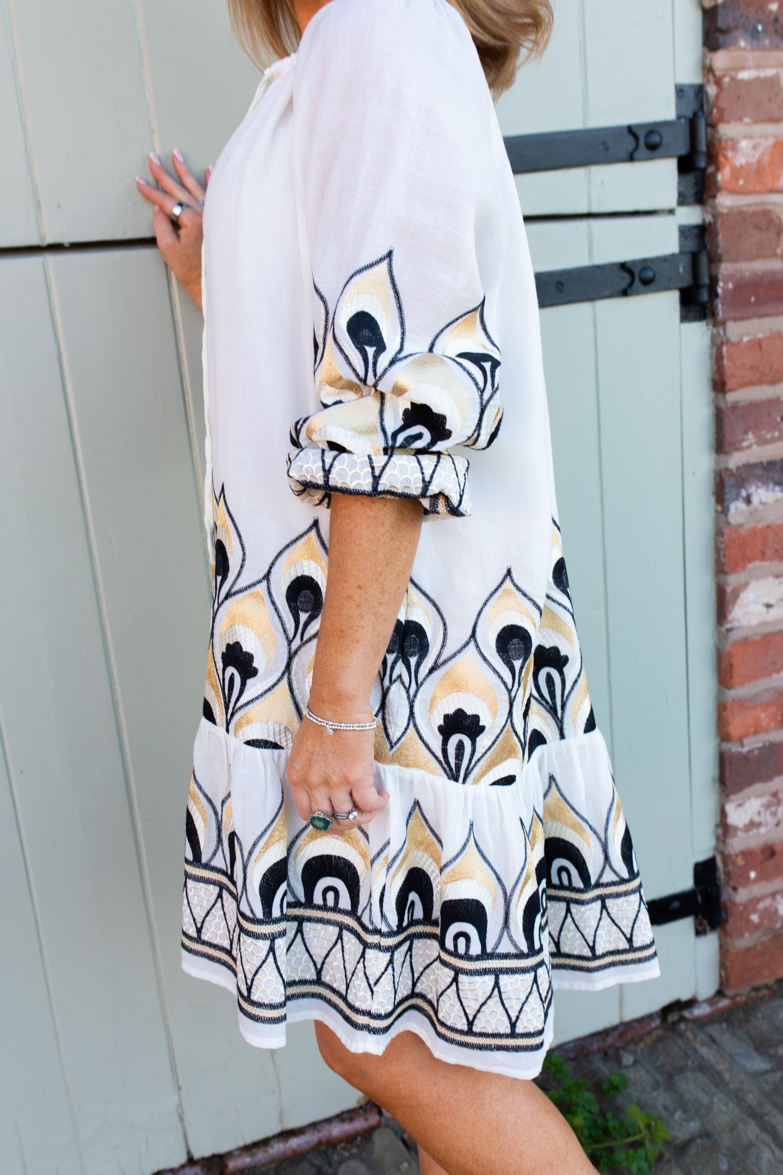 Knee length dress in white woven fabric featuring contrasting black and gold embroidery throughout. This style has a self tie neckline and elasticated cuffs as well as a self tie rope belt, giving you different options for styling. Channel your bohemian style in this gorgeous dress- perfect for holidays and summer soirees.