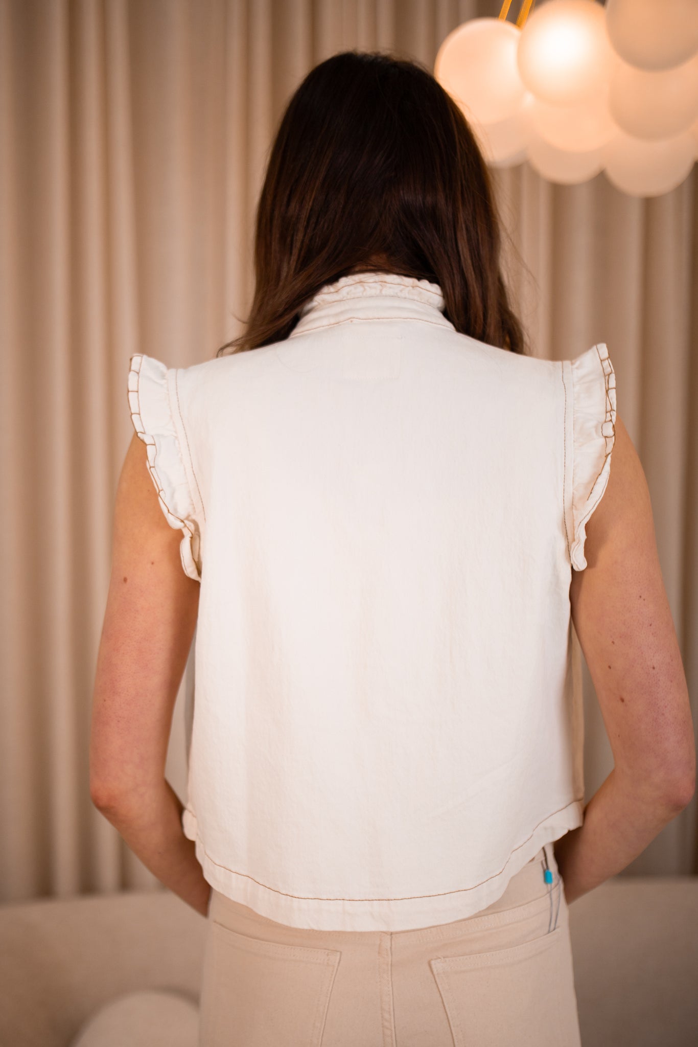 Cream denim waistcoat featuring ruffled armholes and collar and blanket stitch details to the armholes and pockets. The perfect layering piece for all seasons.