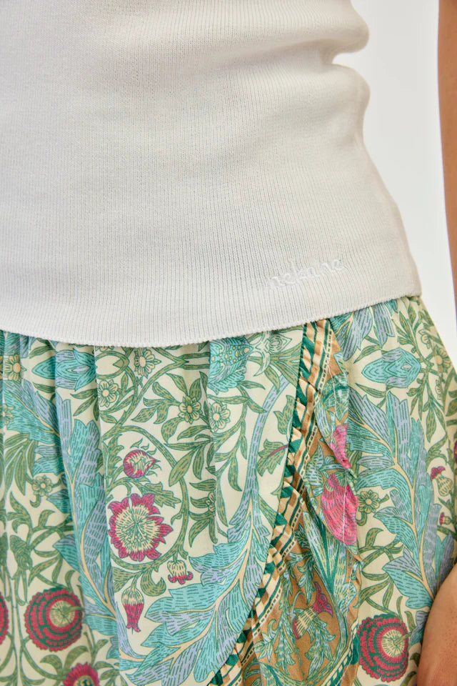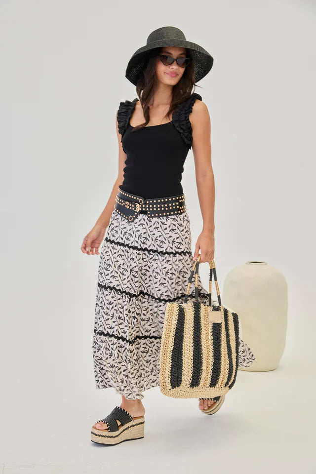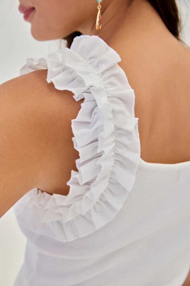 Close fitting top in a ribbed fabric featuring gathered ruffle straps. This style has a square neckline and is available in black and white.