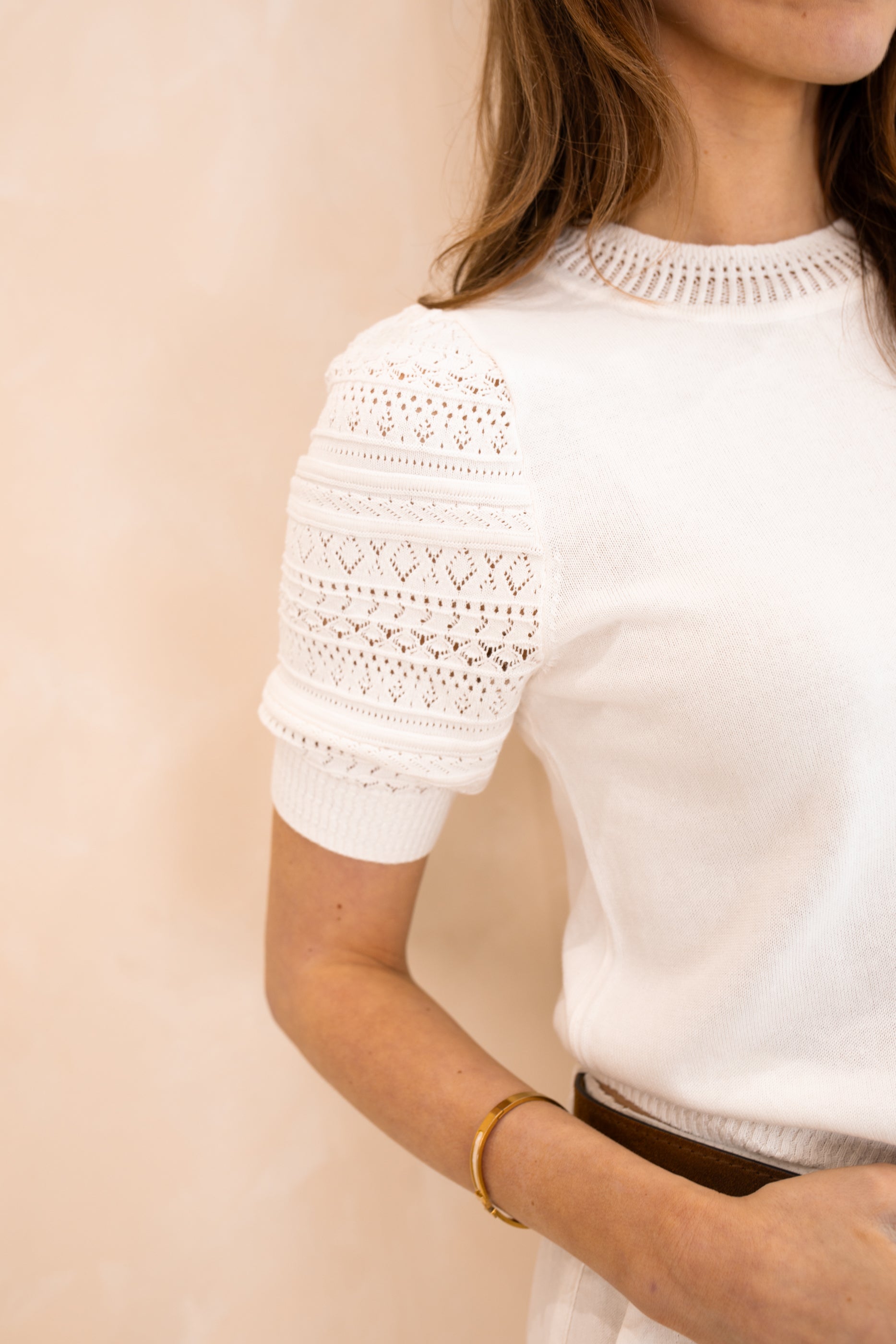 Knitted, cotton top with short sleeves. This style is close fitting and has subtle puff sleeves and ribbed details to the cuffs, hemline and neckline.