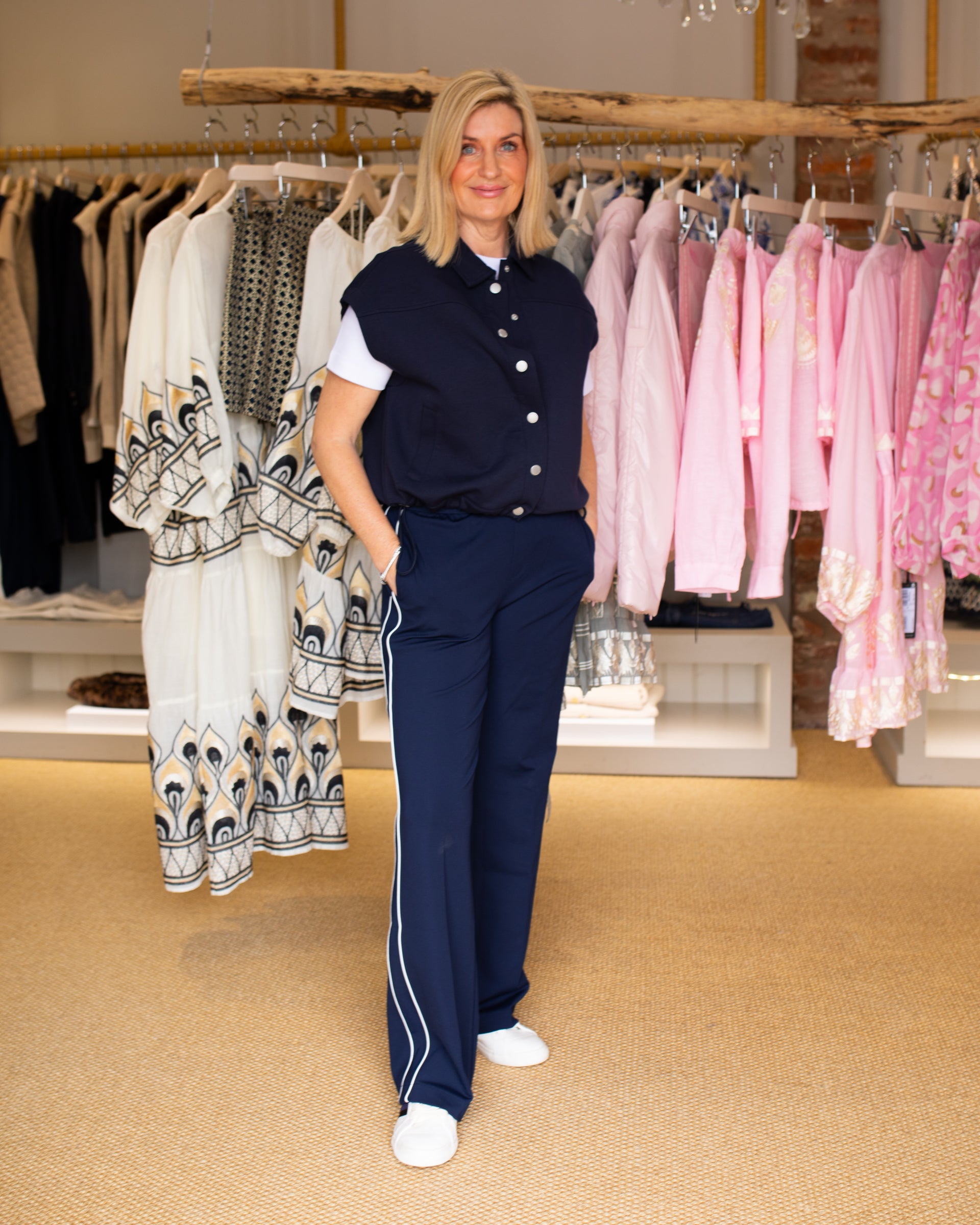 Wide leg joggers in a beautiful Punta Milano stretch fabric. This style has an elasticated waistband and contrasting white side stripes. The bold blue really makes a statement for spring. Style it with the co-ordinating Riley Navy Top.