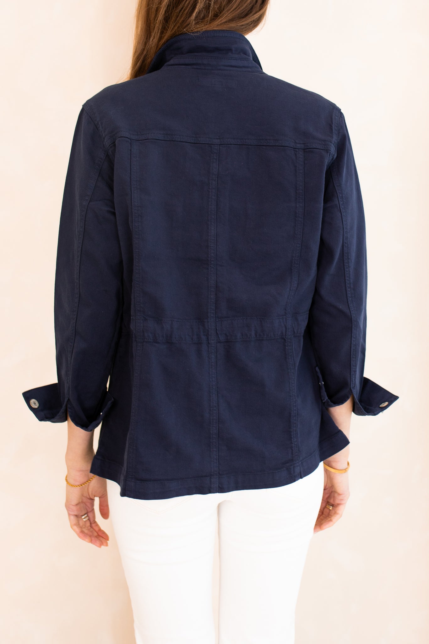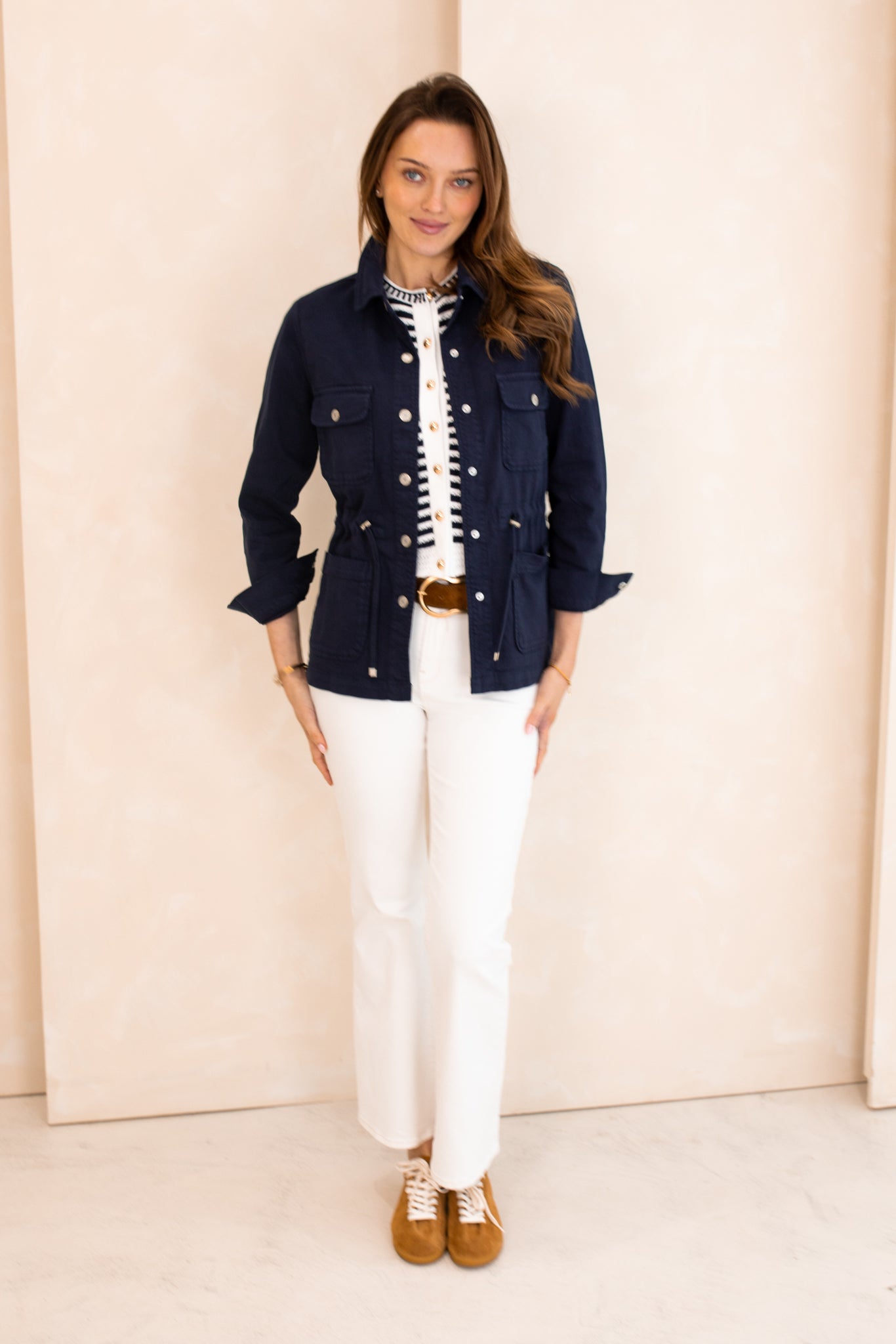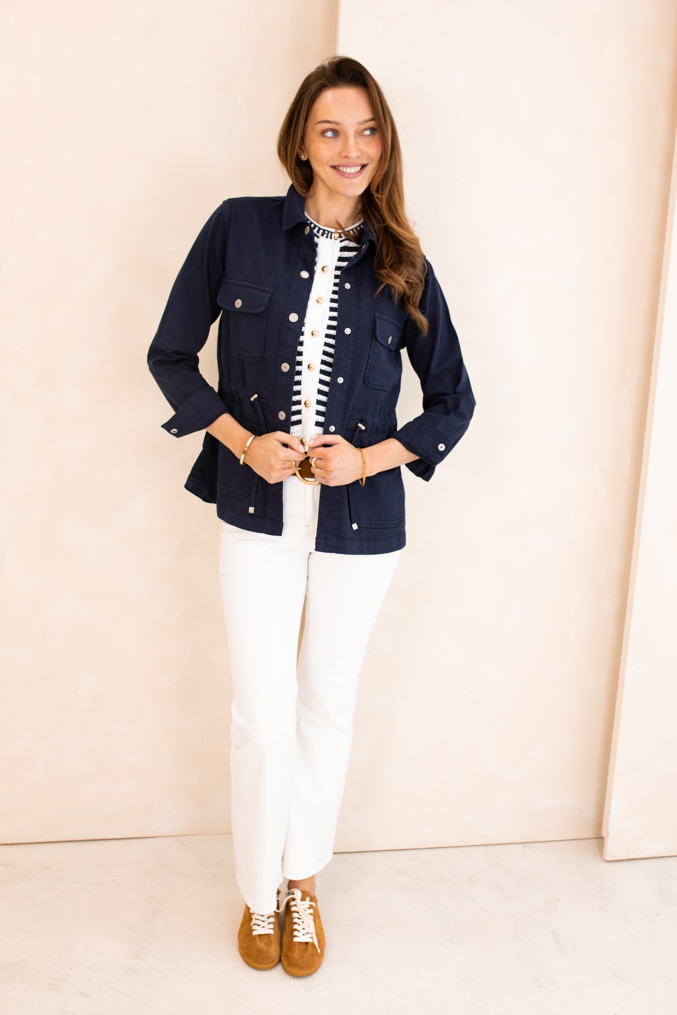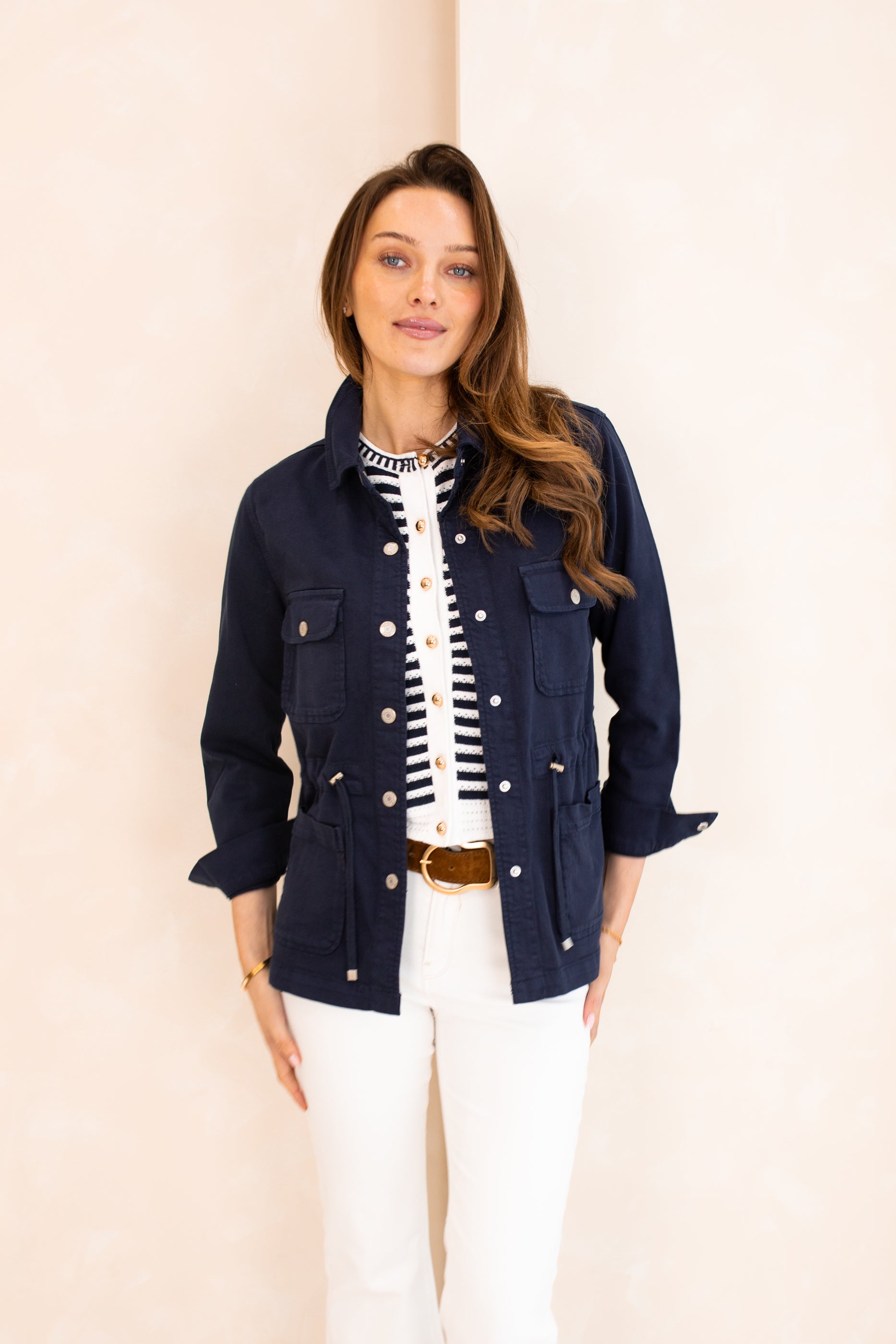 Khaki denim shirt jacket with drawstring feature at the waist. This jacket is a super soft, cotton blend denim with buttons up the front and long sleeves. A versatile, staple style for your seasonal wardrobe.