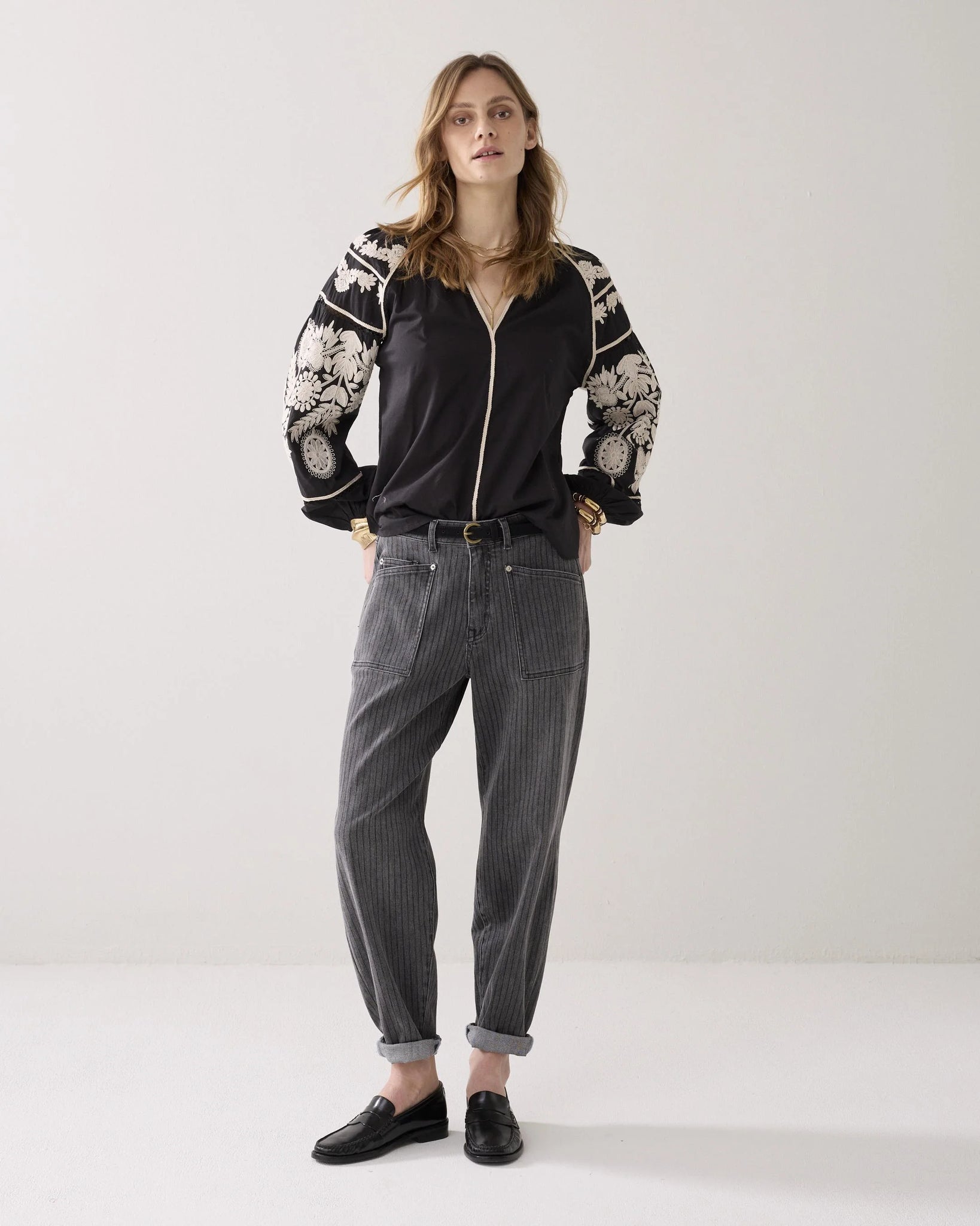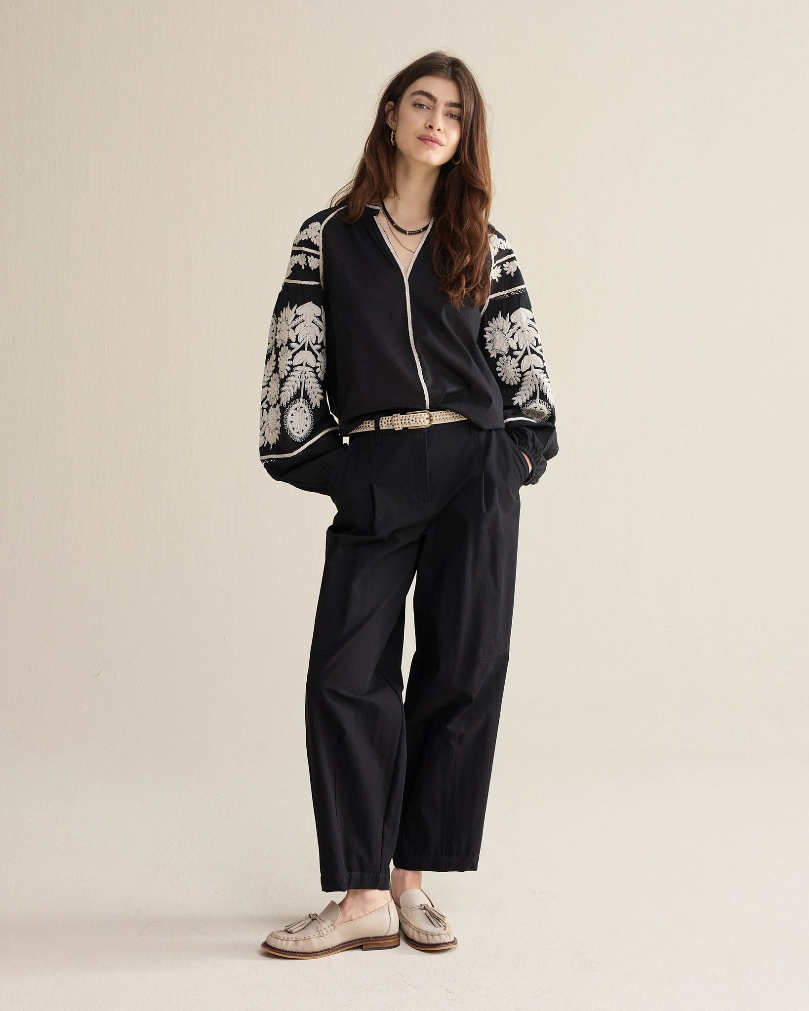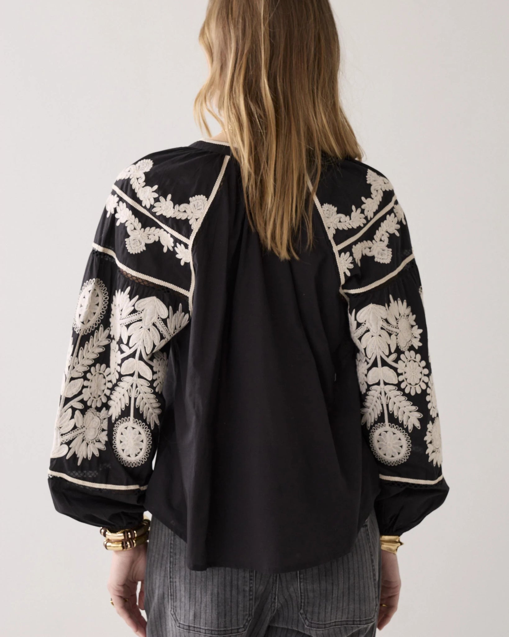Bohemian top in a light, soft cotton fabric with a loose-fitting boxy fit. The top is finished with openwork sections at the sleeve insets and contrasting embroidery. The lace yoke continues down the front and back and across the sleeves.
